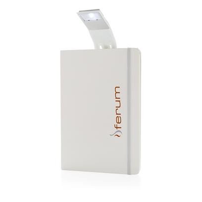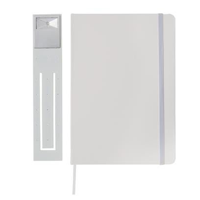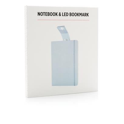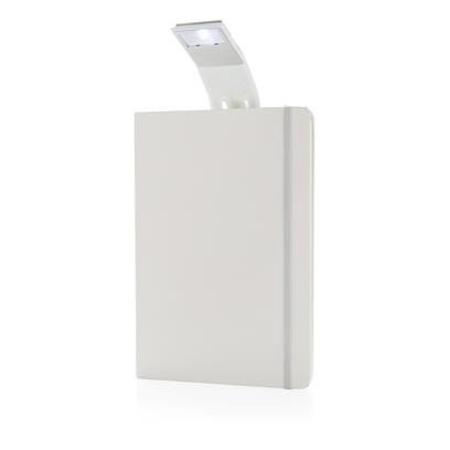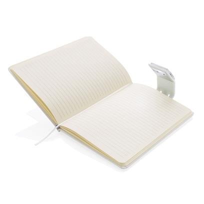liniertes A5 Notizbuch mit Hardcover und LED Lesezeichen. 160 cremefarbene Seiten, 70gr/m².