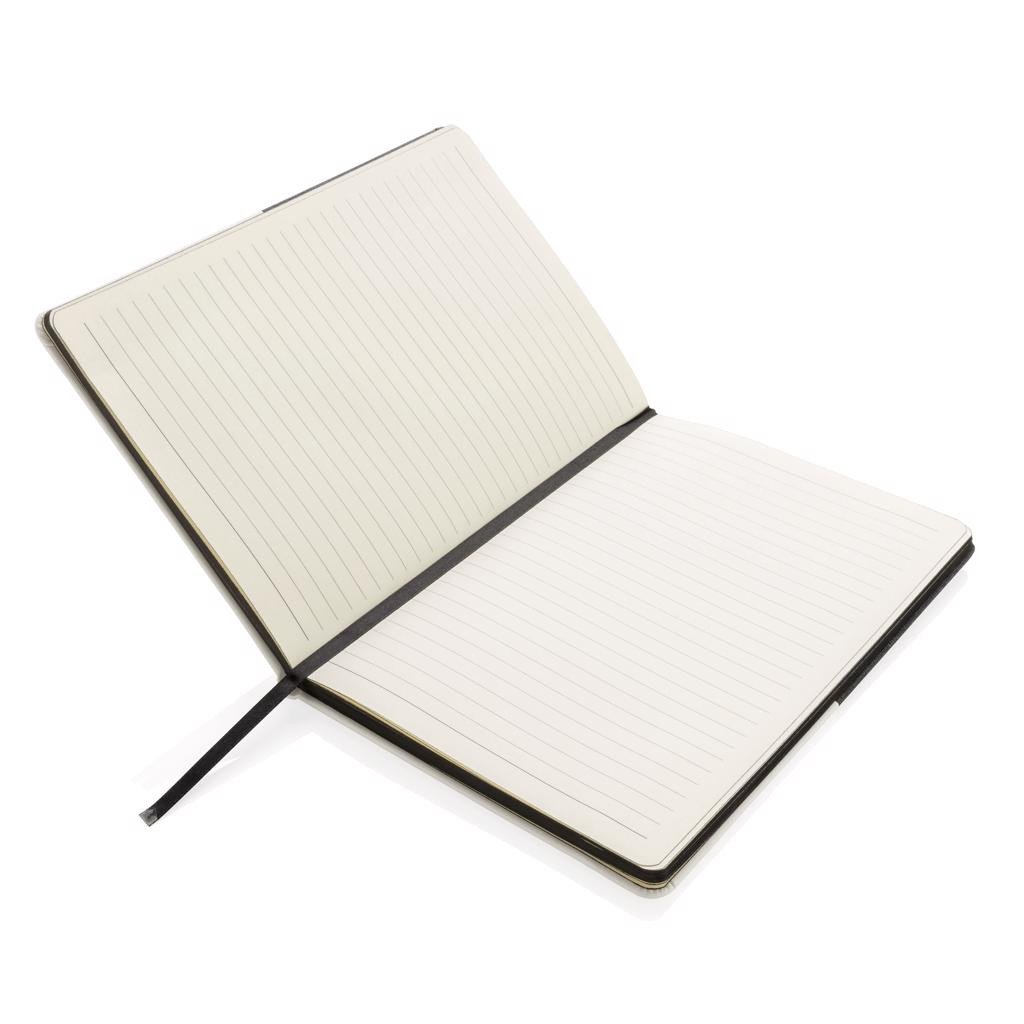 Deluxe Notizbuch mit PU Cover und farbigem Beschnitt. 96 Blätter/192 Seiten creme-farbenes Papier 80g/m². Mit Seitentrenner und elastischem Verschlußband.