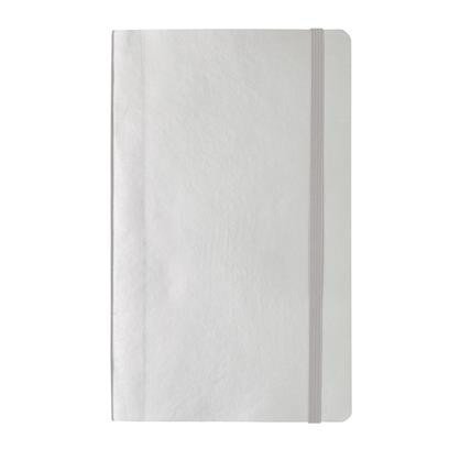 Liniertes Softcover Notizbuch mit elastischem Verschlußband in metallic Optik. Maße 210x130mm, 160 cremefarbene Seiten, 80gr/m².