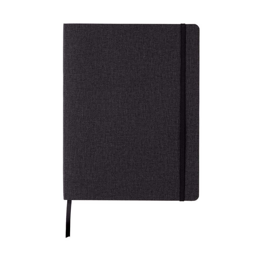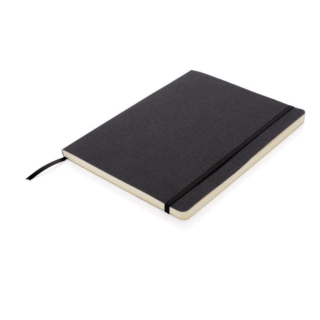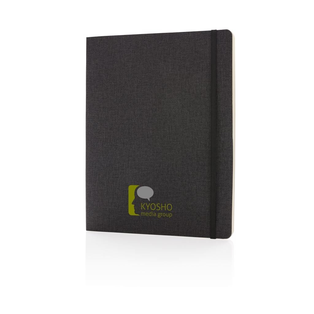 Flexibles Softcover-Notizbuch. B5-Format: 19x25cm. Elastischer Verschluss, Lesezeichen-Band und Rückentasche. 160 cremefarbene Seiten aus 78g/m² innen.