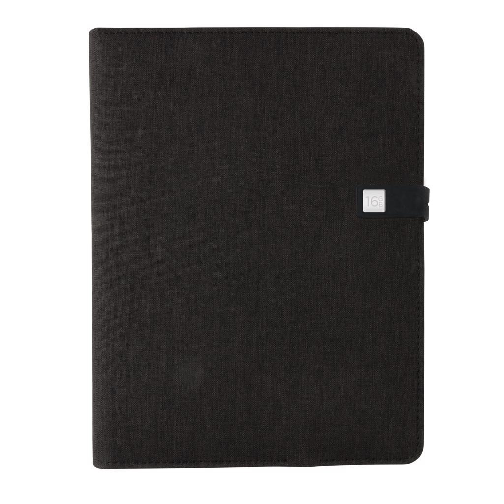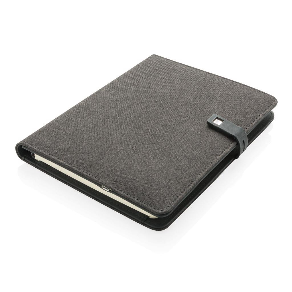 Das Stoff-Notizbuch mit eingebauter 3.000 mAh Powerbank und Smartphoneständer hat auch noch einen herausnehmbaren 16 GB 2.0 USB Stick im Magnetverschluß. Output & Input: 5V/1A. Geschütztes Design®.