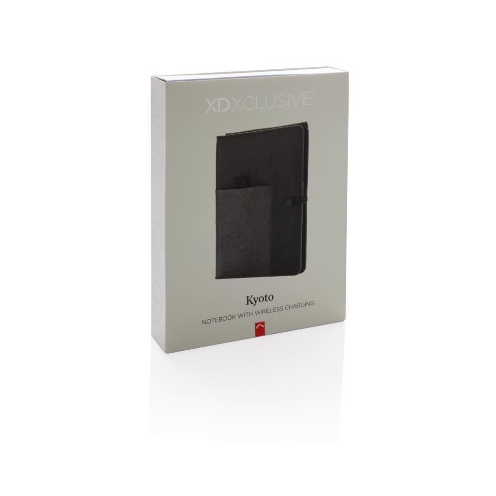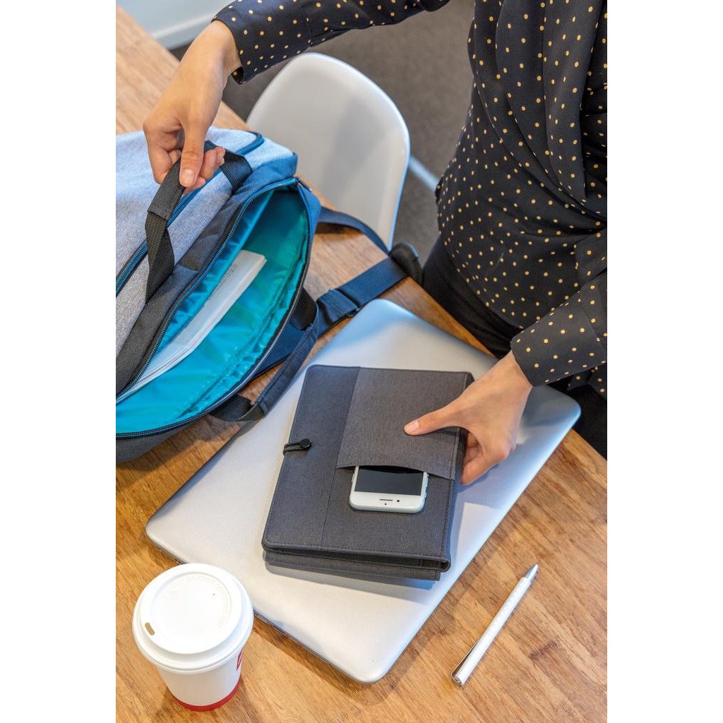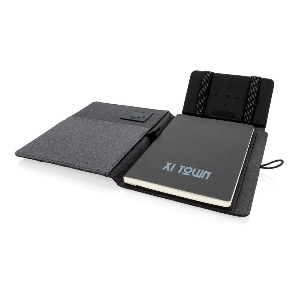 XD Xclusive Kyoto A5 Schreibmappe mit kabellosem Ladegerät. Schreibe und lade dein Handy gleichzeitig oder unterwegs kabellos auf. Mit herausnehmbarem Notizbuch, 128 linierten, cremefarbenen Seiten von 80 g/m². Inklusive kabelloser 4.000 mAh Powerbank. Kompatibel mit allen QI-fähigen Geräten wie Android der neuesten Generation, iPhone 8 und höher. Eingang: 5.0V/1.0A. Ausgang: 5.0V/2.1A. Kabelloser Ausgang: 5W. Hergestellt aus rPET (recycelte PET-Flaschen). Eingetragenes Design®.