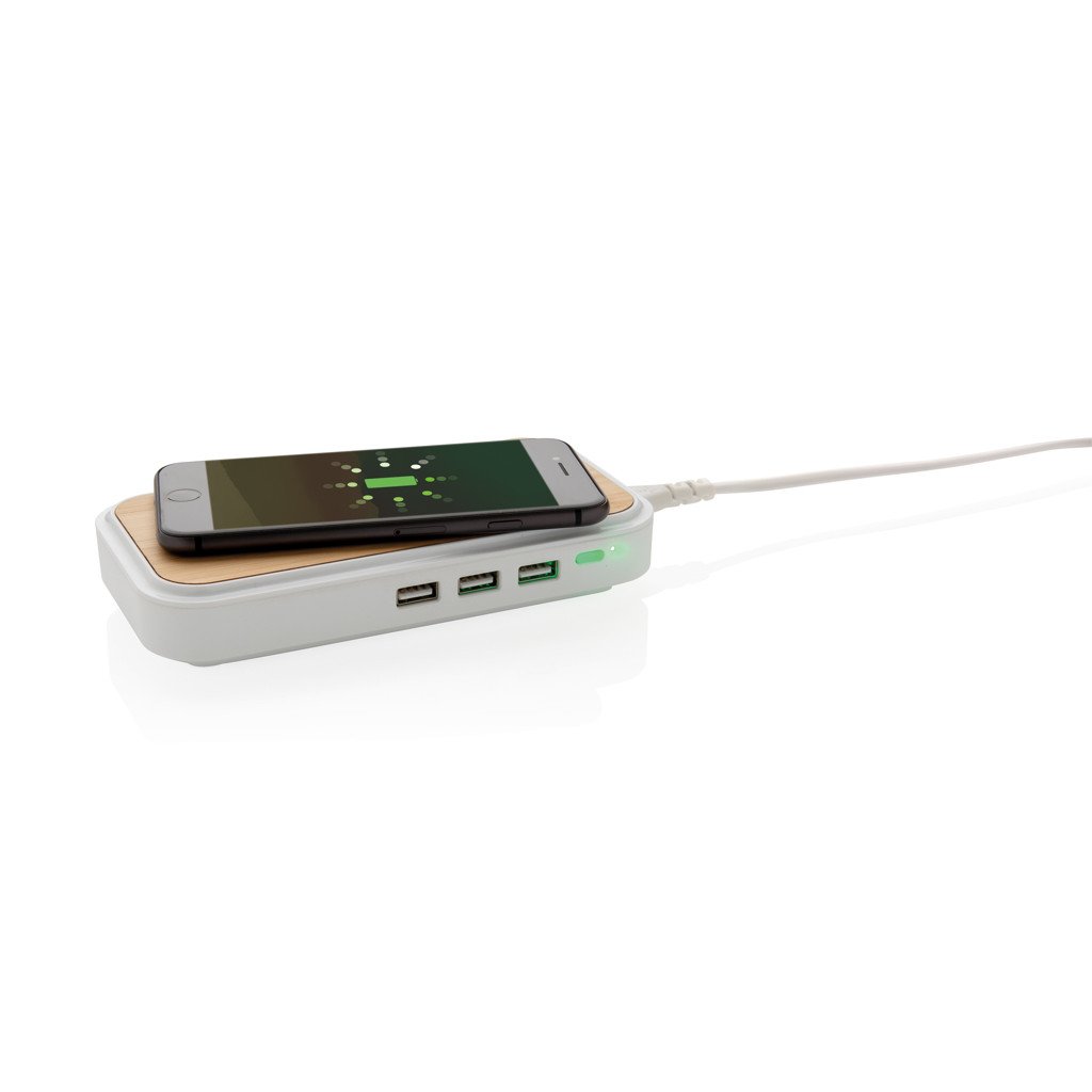 "ECO Power Station mit 5W integriertem Wireless-Ladegerät und 3 leistungsstarken USB-Ports; aus natürlichem und langlebigem Bambus. Der Artikel kommt mit einem Netzteil mit EU-Stecker, um ausreichend Strom zu liefern. Input AC 100V-240V. USB-Output 5V/2.4A. Wireless Output 5V/1A 5W. Inkl. 150cm Kabel.