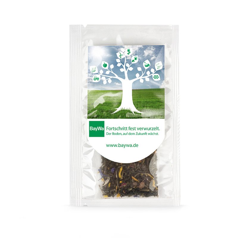 Zeit für eine Teepause! Schenke deinen Kunden zur Abwechslung mal eine gemütliche Pause. Unser klimaneutraler Premium Tee bietet den optimalen Ausgleich zum stressigen Arbeitsalltag und vermittelt nebenbei entspannt deine Werbebotschaft. Wähle deine Lieblings Teesorte und stimme das Etikett individuell auf deine Kunden ab. So geht entspanntes werben! Premium-Tee mit einem auffälligen Etikett, das in voller Farbe mit deinem Design bedruckt werden kann. Das Tütchen ist in einer transparenten Folie verpackt.
