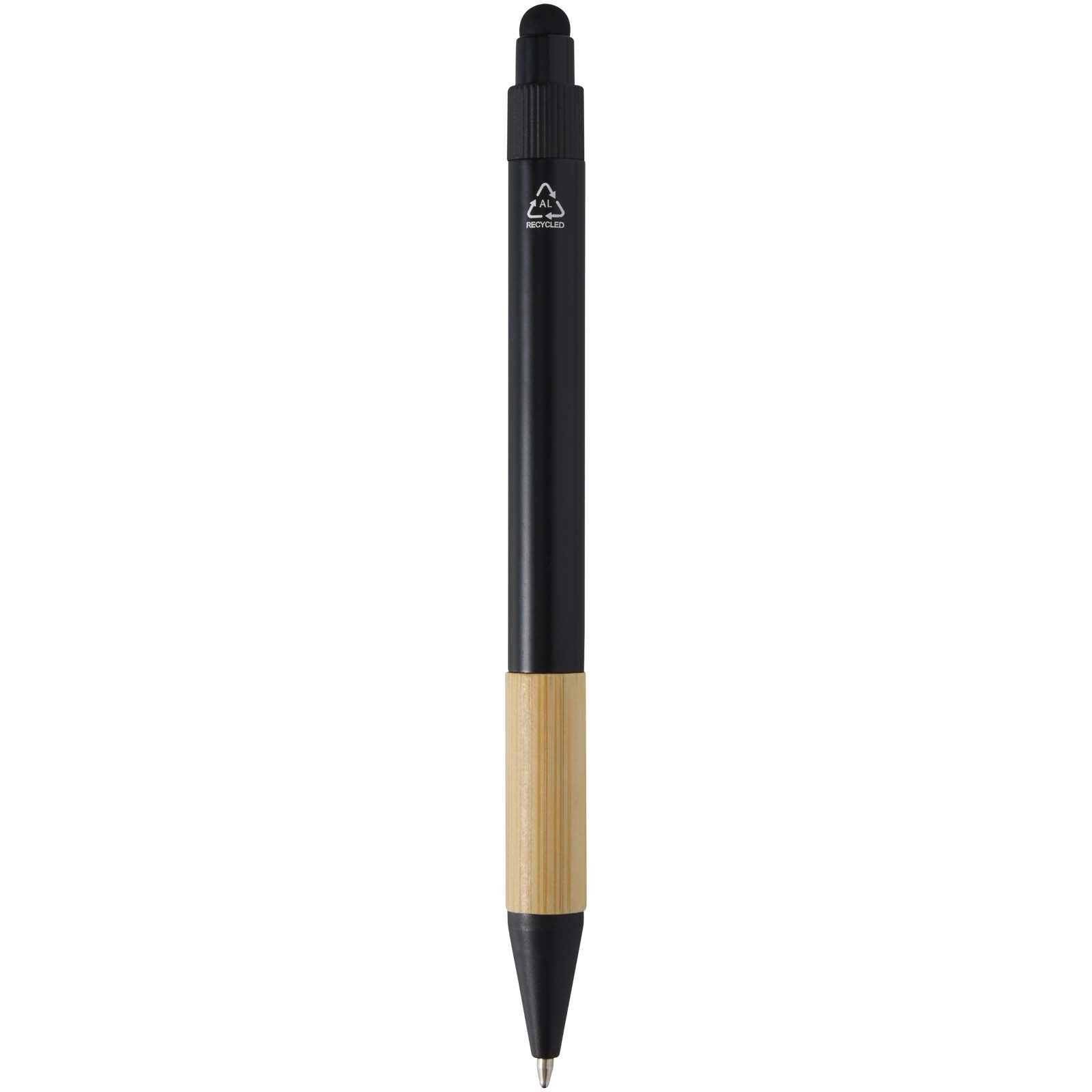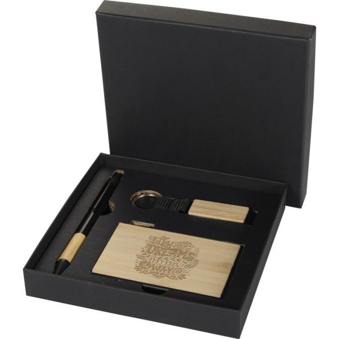 Das Minka Set enthält einen Kugelschreiber aus RCS-zertifiziertem Recycling-Aluminium mit elegantem Bambusgriff und Touchpen-Spitze, einen Aluminium-Schlüsselanhänger (5,5 × 1,8 × 1 cm) mit Bambusdetails und integrierter Telefonhalterung, sowie einen RFID-Kartenhalter (9,7 × 6,2 × 1 cm) mit Gehäuse aus Aluminiumlegierung und Bambusdetails, der bis zu 10 Karten schützt. Der Kugelschreiber ist mit schwarzer Mine ausgestattet und hat eine Schreiblänge von 1000 Metern. Ein durchdachtes, praktisches Produkt, das Funktionalität mit modernem Design verbindet. Geliefert in einer hochwertigen schwarzen Geschenkbox (16 × 16 × 2,7 cm).