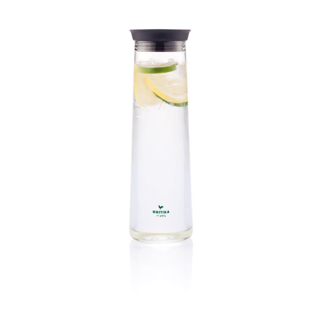Trendige 1,2 Liter Wasserkaraffe aus Glas mit Silikonverschluss.