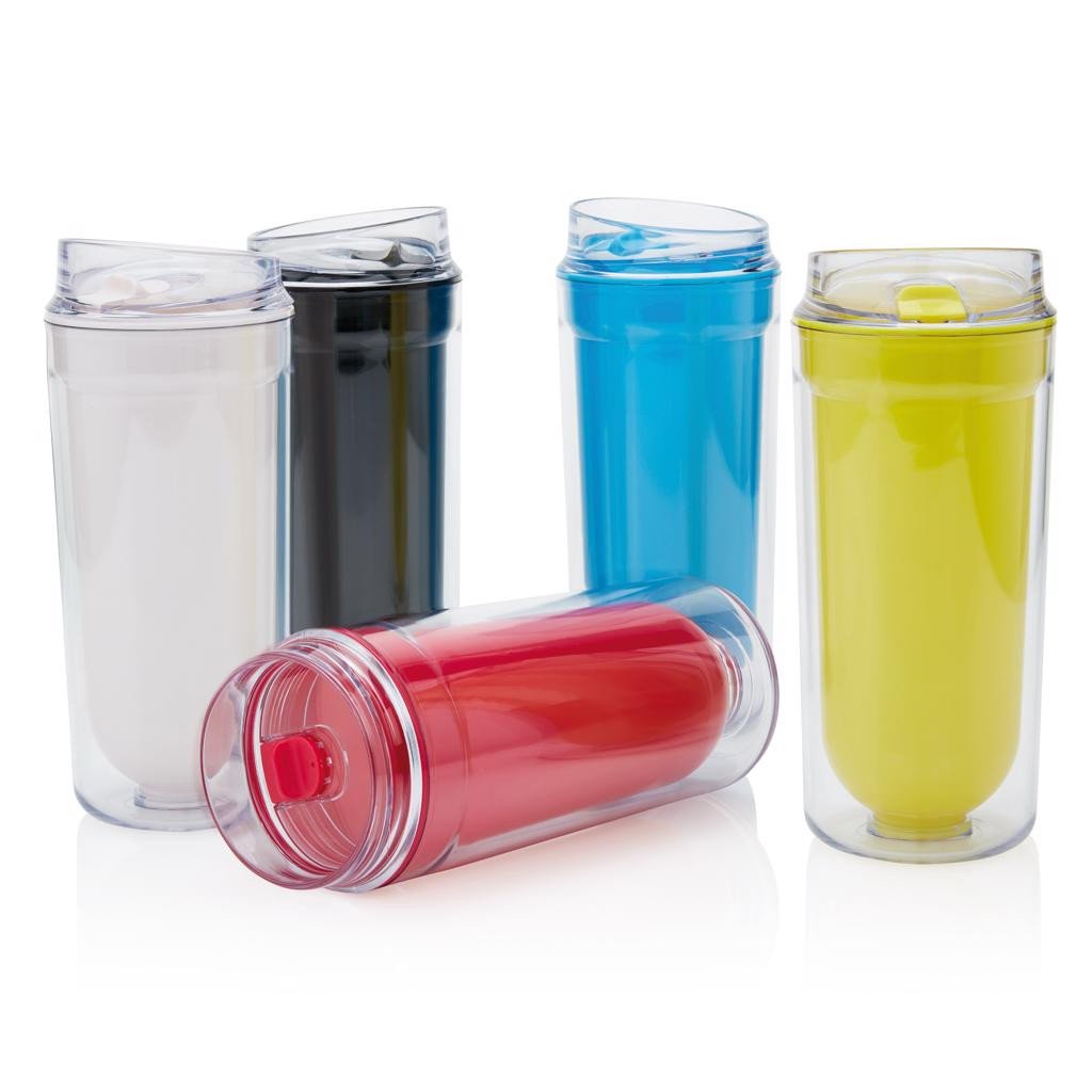 400ml Becher aus transparentem Kunststoff, doppelwandig. Inkl. einfach wiederverschließbarem Deckel.