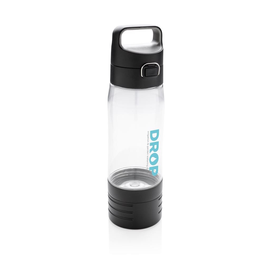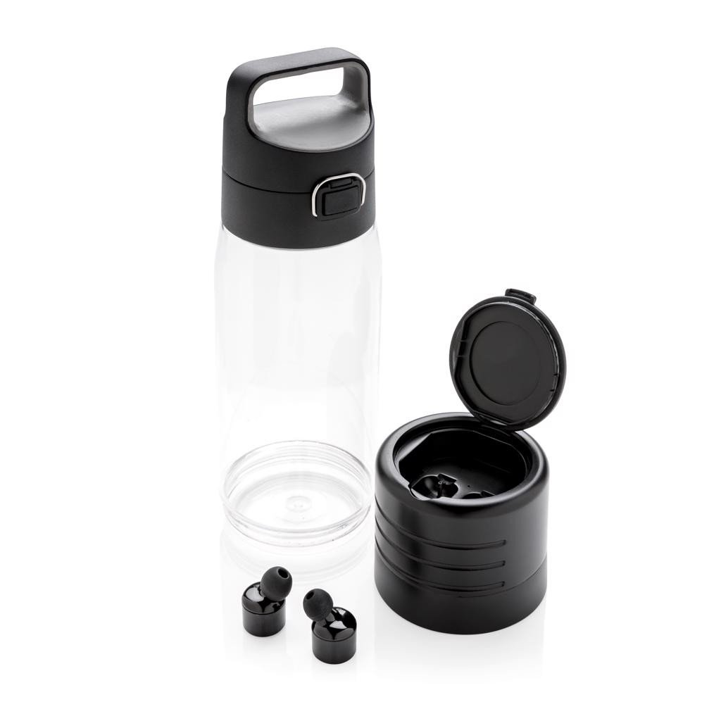 Auslaufsichere Tritanflasche mit Verschluss und Griff. Inhalt: 600 ml. Unteres Fach mit kabellosen Ohrhörern. 600 mAh-Akku für 4 Stunden Musikgenuss. Inklusive 50 cm langem Micro-USB-Kabel. Eingetragenes Design®.
