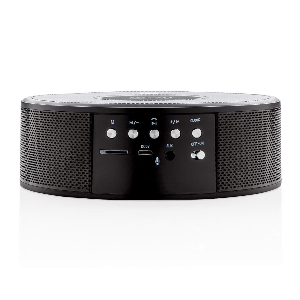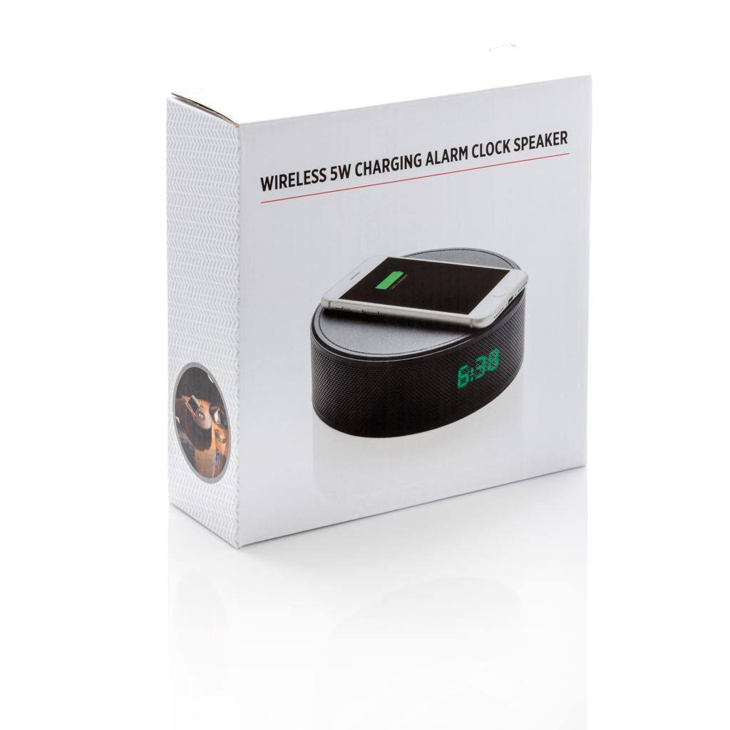 Origineller kabelloser Lautsprecher mit integrierter kabellosen Ladestation und Alarm Funktion. Der kabellose Lautsprecher hat 2x3W Lautsprecher, welche einen hervorragenden Sound garantieren. Die integrierte 4000 mAh Batterie lädt dein Gerät über eine kabellose Ladestation. Perfekt um dein Smartphone kabellos über Nacht zu laden. Der Lautprecher beinhaltet ein FM Radio, eine Alarm Funktion und eine Freisprecheinrichtung. Das Gerät funktioniert auf einer Distanz von 10m. Es kann bis zu 8 Stunden lang Musik abgespielt werden. Das Gerät kann sowohl auf Batterie betrieben werden, als auch über den USB Port verbunden werden. ABS Material. Kabelloses Laden ist kompatibel mit Android der letzten Generation, iPhone 8 und höher. Input: 5V 2A. Wireless Output: Output: 5V/1A 5W.