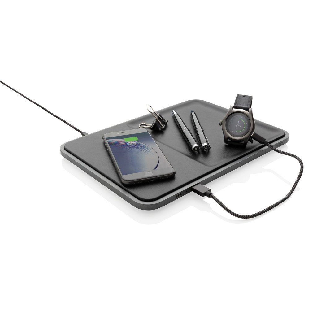 Stylischer 5W Wireless Charger aus hochwertigem PU und ABS. Laden Sie Ihr Smartphone kabellos in dem Sie es auf dem PU Pad platzieren und mit der Ablage sogar noch Ihren Schreibtisch aufgeräumt halten. Der Charger hat auch einen USB und Type-C Port um Ihr Smartphone auch herkömmlich über Kabel zu laden. Kabelloses Laden ist möglich mit allen QI-fähigen Geräten wie den Androids der neusten Generation sowie ab iPhone 8 Input: 5V/2A. Wireless Output: 5V/1A. USB Output/Type-C Output: 5V/1A. Inkl. 150cm Micro-USB Ladekabel.
