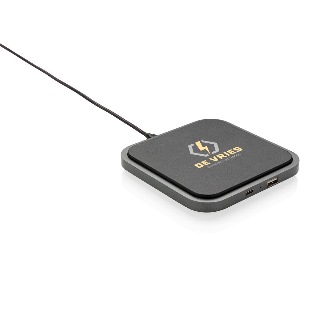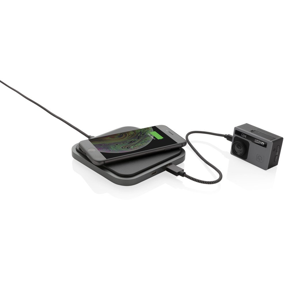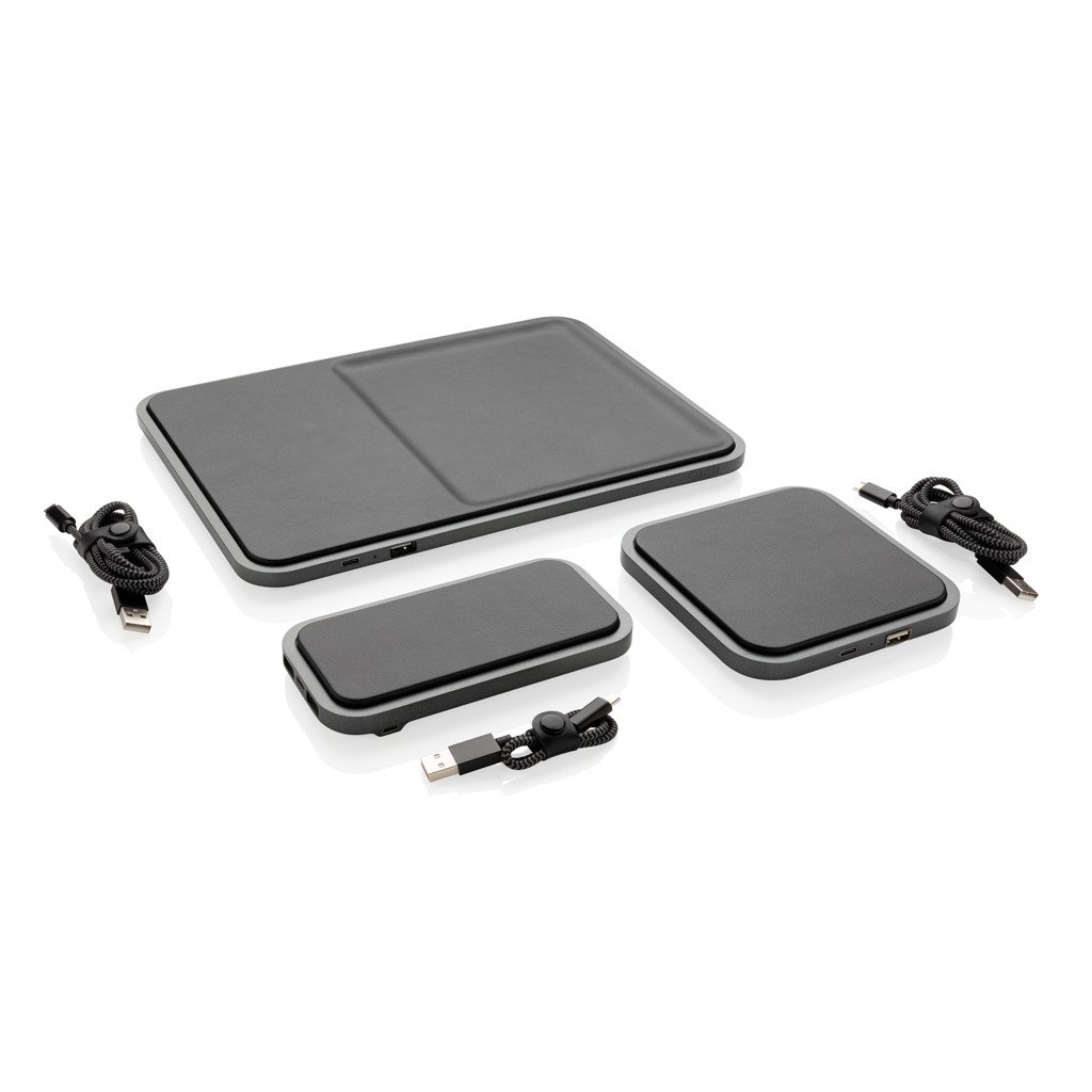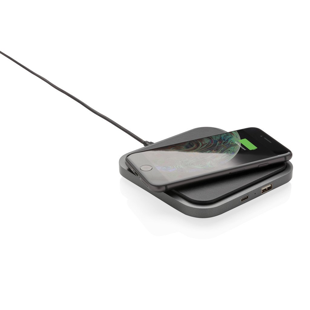 Stylischer 5W Wireless Charger aus hochwertigem PU und ABS. Laden Sie Ihr Smartphone kabellos in dem Sie es auf dem PU Pad platzieren oder nutzen Sie den Type-C oder USB Output. Kabelloses Laden ist möglich mit allen QI-fähigen Geräten wie den Androids der neusten Generation sowie ab iPhone 8. Input: 5V/2A. Wireless Output: 5V/1A. USB und Type-C Output: 5V/1A. Verpackt in schicker Geschenkbox mit 150cm Micro-USB Ladekabel.