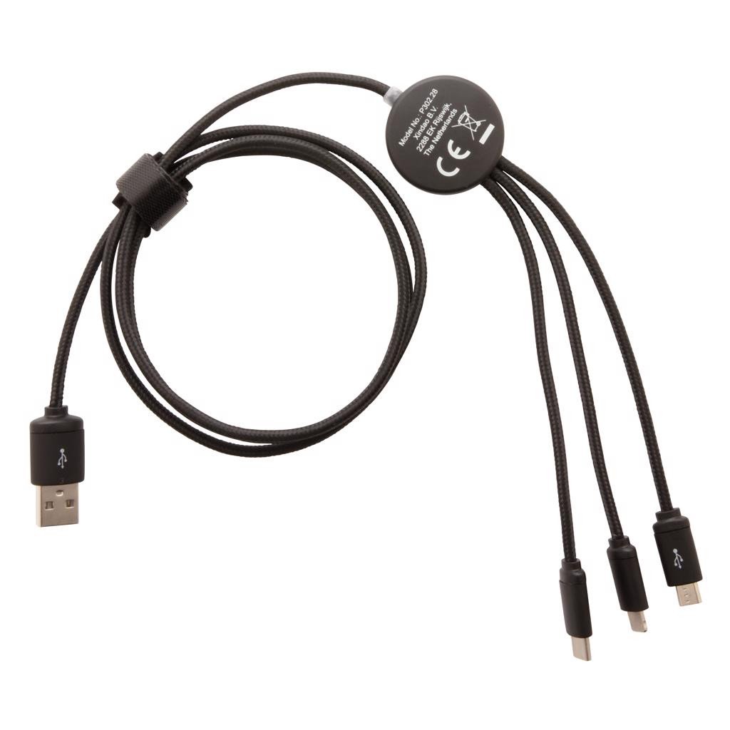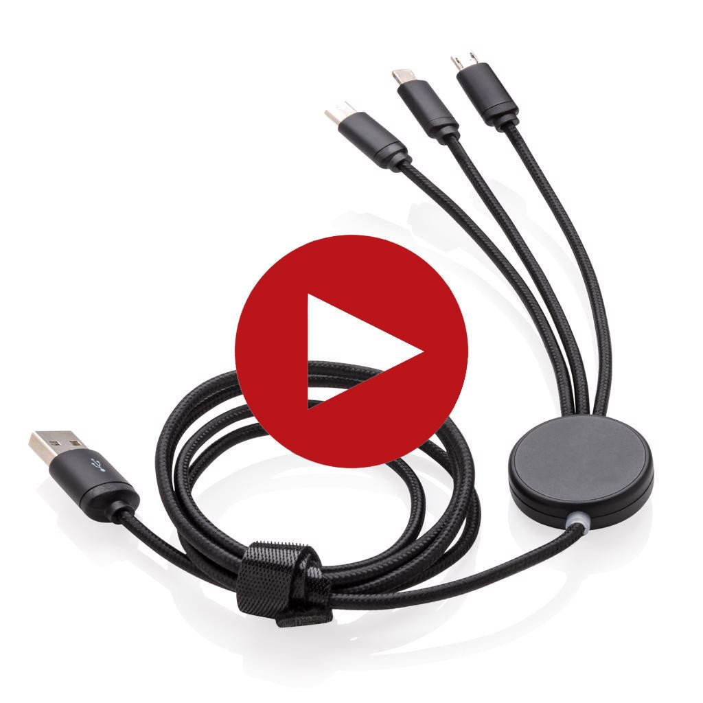 Stylisch umwobenes 3-in-1 Kabel mit Type-C, Micro USB und iOS-Anschluß. Wenn der mittlere Teil graviert wird, erstrahlt Ihr Logo sobald das Kabel verwendet wird. Nur zum Laden geeignet. Länge 120cm.