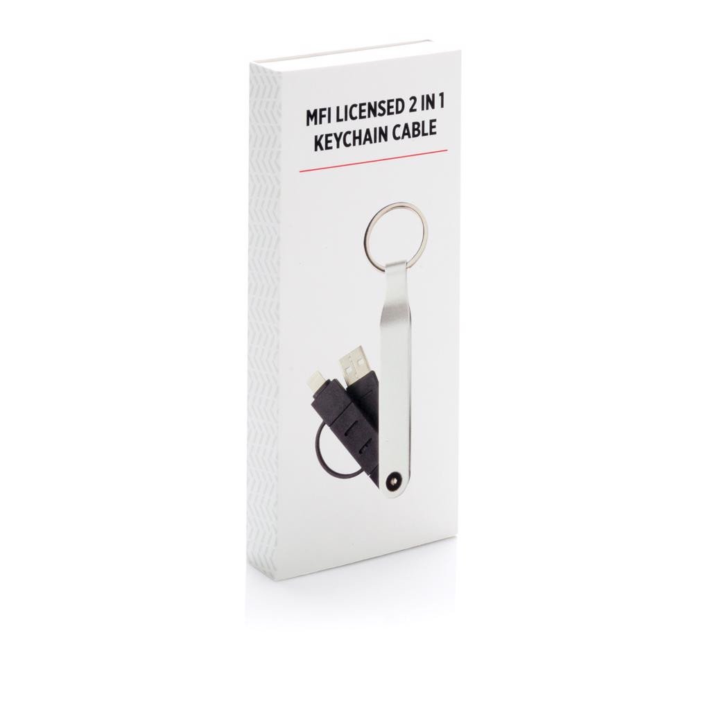 Praktischer 2-in-1 Schlüsselanhänger mit MFi (made for iPhone) Lightning- Stecker und Micro-USB für alle Android Smartphones. Durch den Schlüsselring haben Sie Ihr Kabel immer dabei - sowohl zum Laden als auch zum Datentransfer geeignet. Das Gehäuse ist aus Aluminium und die Kabel aus TPE.
