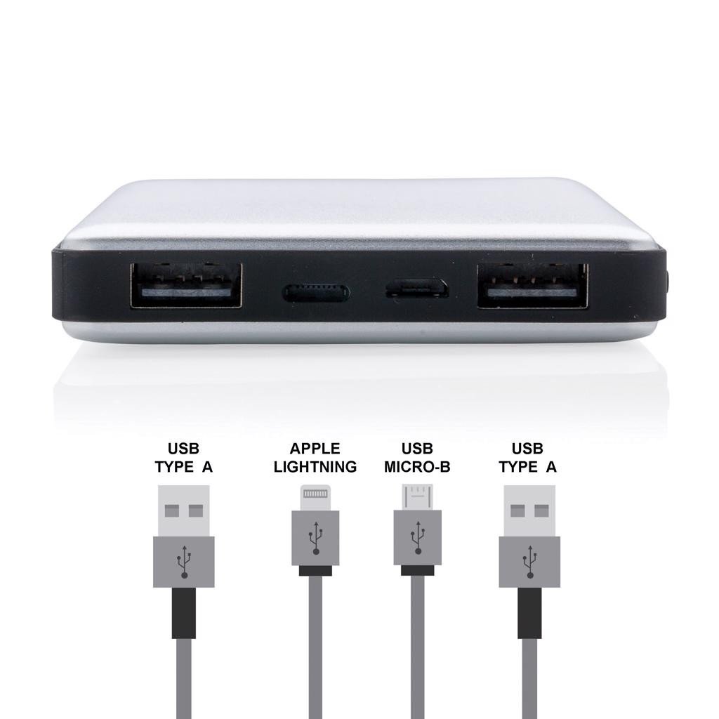 Aluminium Powerbank mit langlebiger 10.000 mAh Lithium Polybatterie. Die Powerbank verfügt über 2 USB Output Ports und 2 Input Ports (Micro USB und Lightning). Bequem für iOS User, um dasselbe Kabel für die Powerbank zum Laden sowie das Telefon zu gebrauchen (Kabel ist nicht in der Lieferung inbegriffen). Geeignet um sowohl Smartphones sowie Tablets zu laden. Die Powerbank verfügt über eine Ladeanzeige, um den Ladezustand der Powerbank anzuzeigen. Output: DC 5V/2.4A Input 5V/2A.