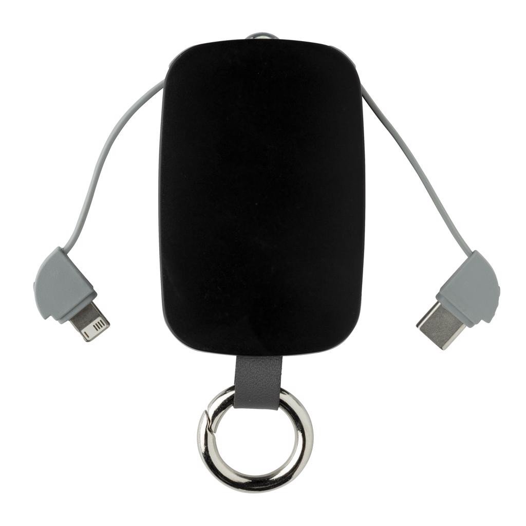 Kompakte 1.200 mAh Pocket-Powerbank mit einer Befestigung um sie immer dabei zu haben, sowie mit einer Taschenlampe. Durch das 3-in-1 Ladekabel (iOS, Micro-USB und Type-C) laden Sie alle Smartphones am Markt. Hergestellt aus ABS mit PVC-freiem TPE Micro-USB Kabel. Die Batterie ist eine A-Grade 1.200 mAh Lithium-Polymer Batterie. Input 5V/1A; Output 5V/1A