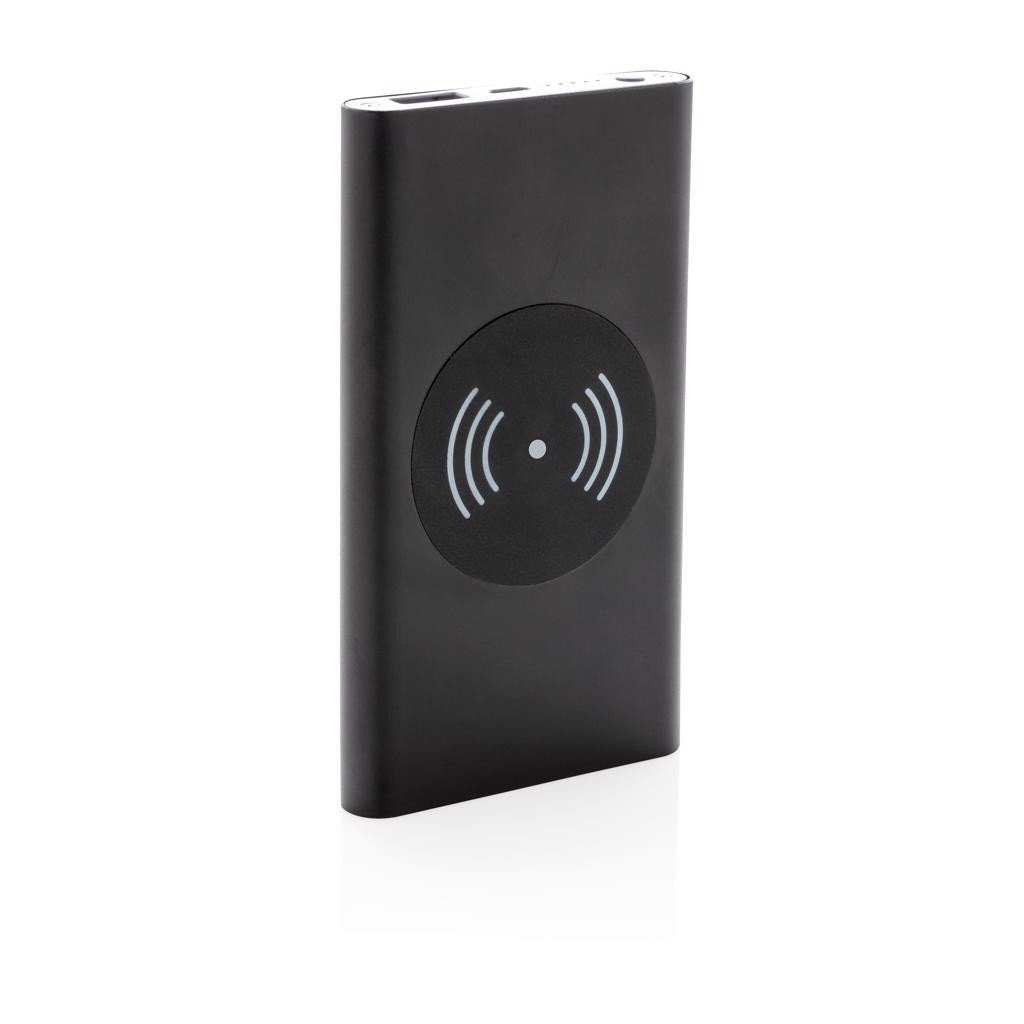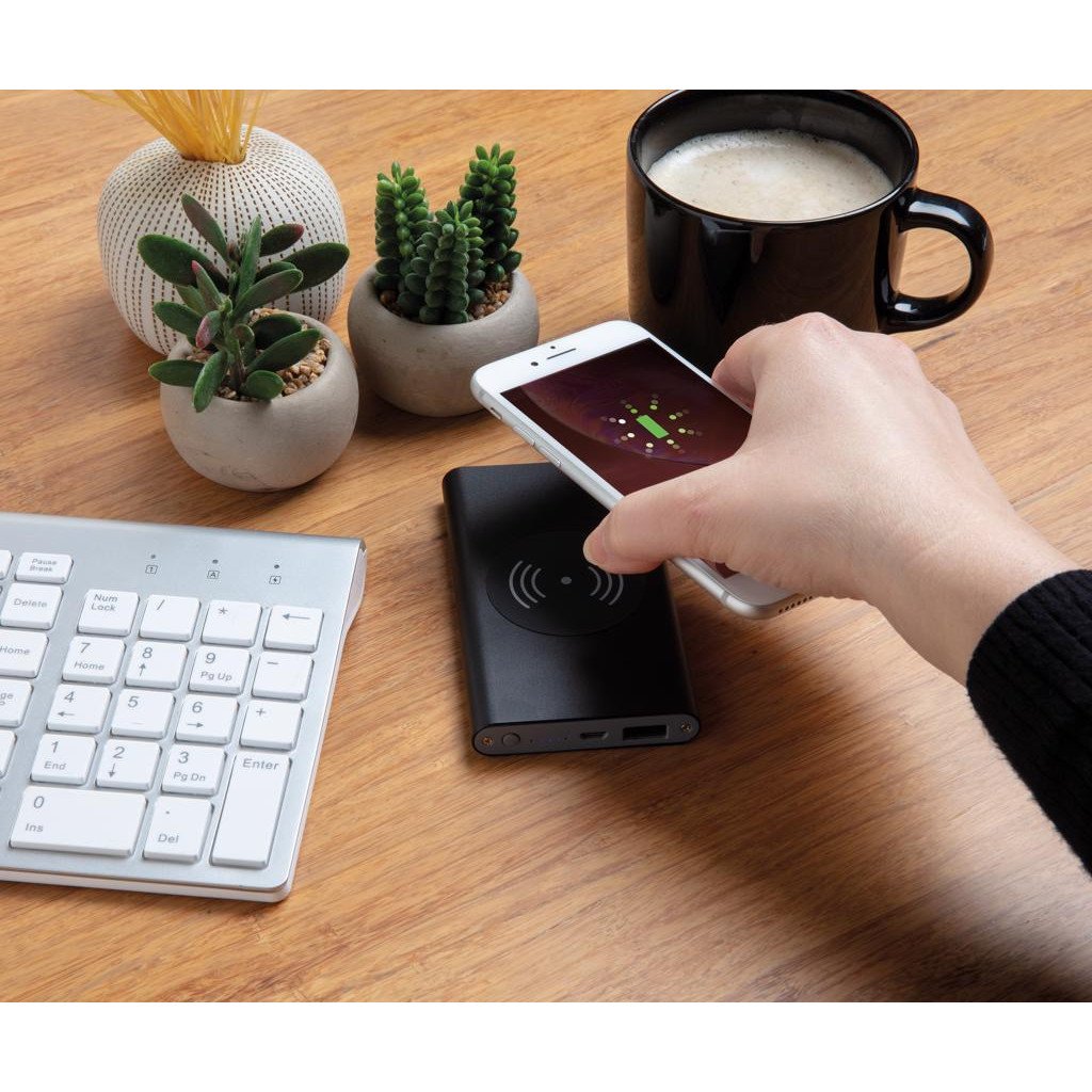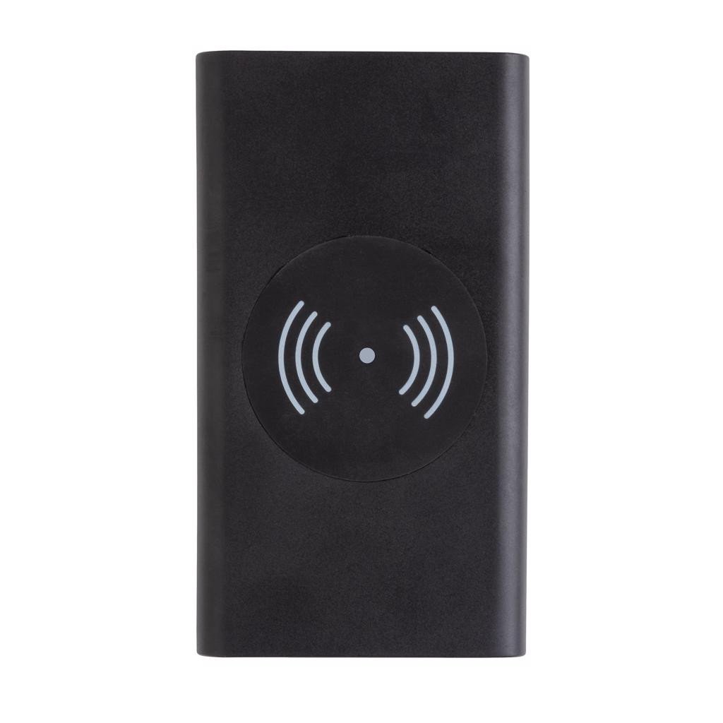 4.000 mAh Powerbank mit Hochleistungs-Lithium-Polymer-Batterie und integriertem 5W kabellosem Ladergerät. Mit An-/Ausschaltknopf und Batteriestandsanzeige. Output 5V/2,1; Input 5V/1,5A; Kabelloser Output: 5W.