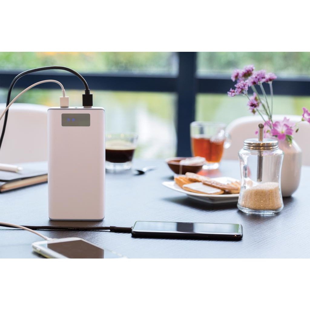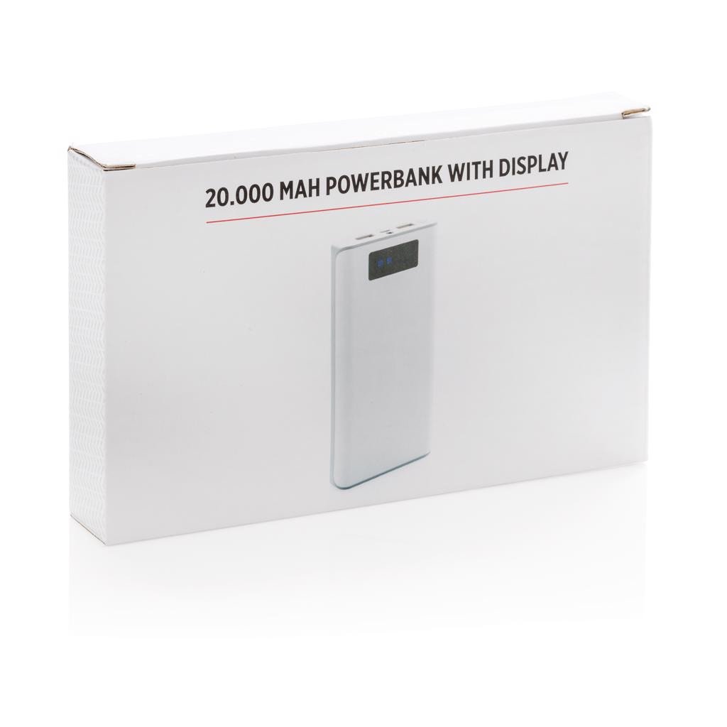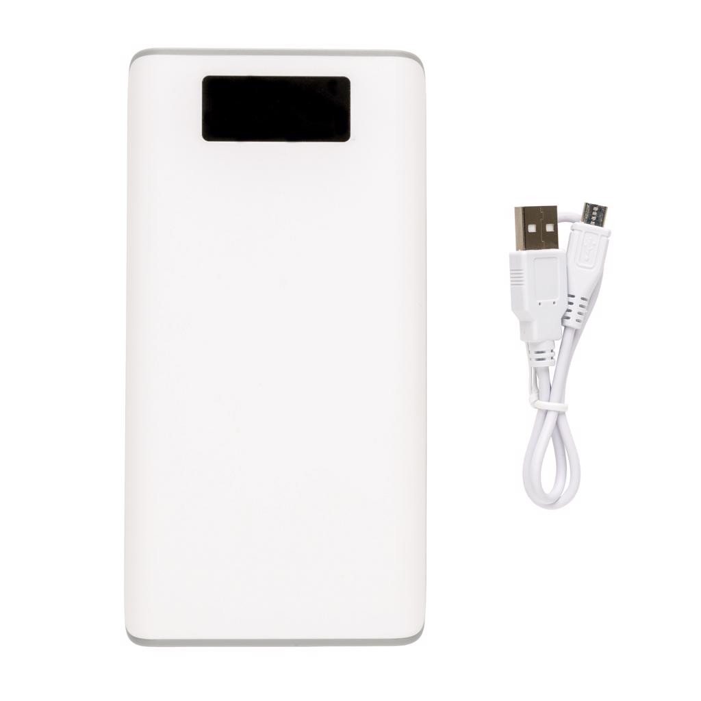 Powerbank mit 20.000mAh Lithium Batterie und Display, welches den Ladestand anzeigt (25%-50%-75%-100%). Die Powerbank verfügt über 2 Outputs (max. 2.1A), um zwei Geräte zur selben Zeit aufzuladen. Output 5V/2.6mAh, Input 5V/A. Inklusive Micro USB Kabel.