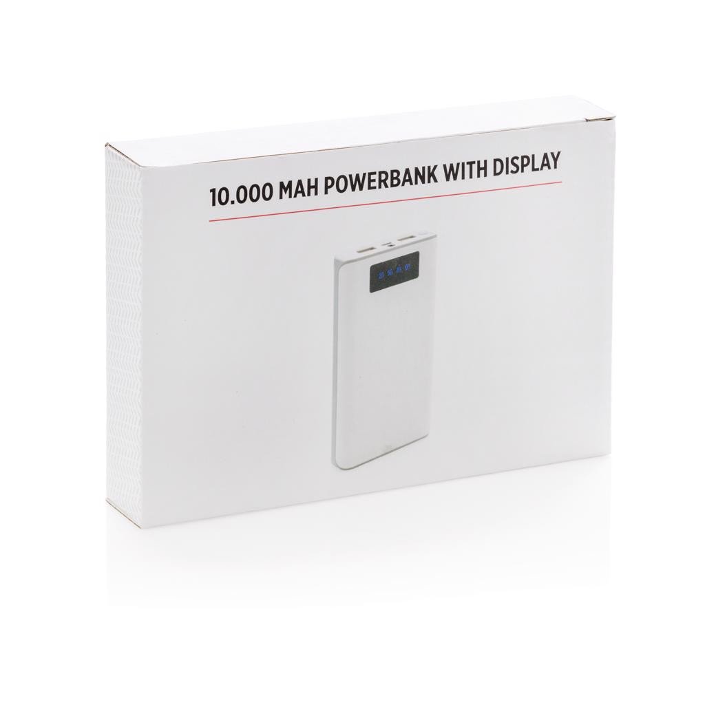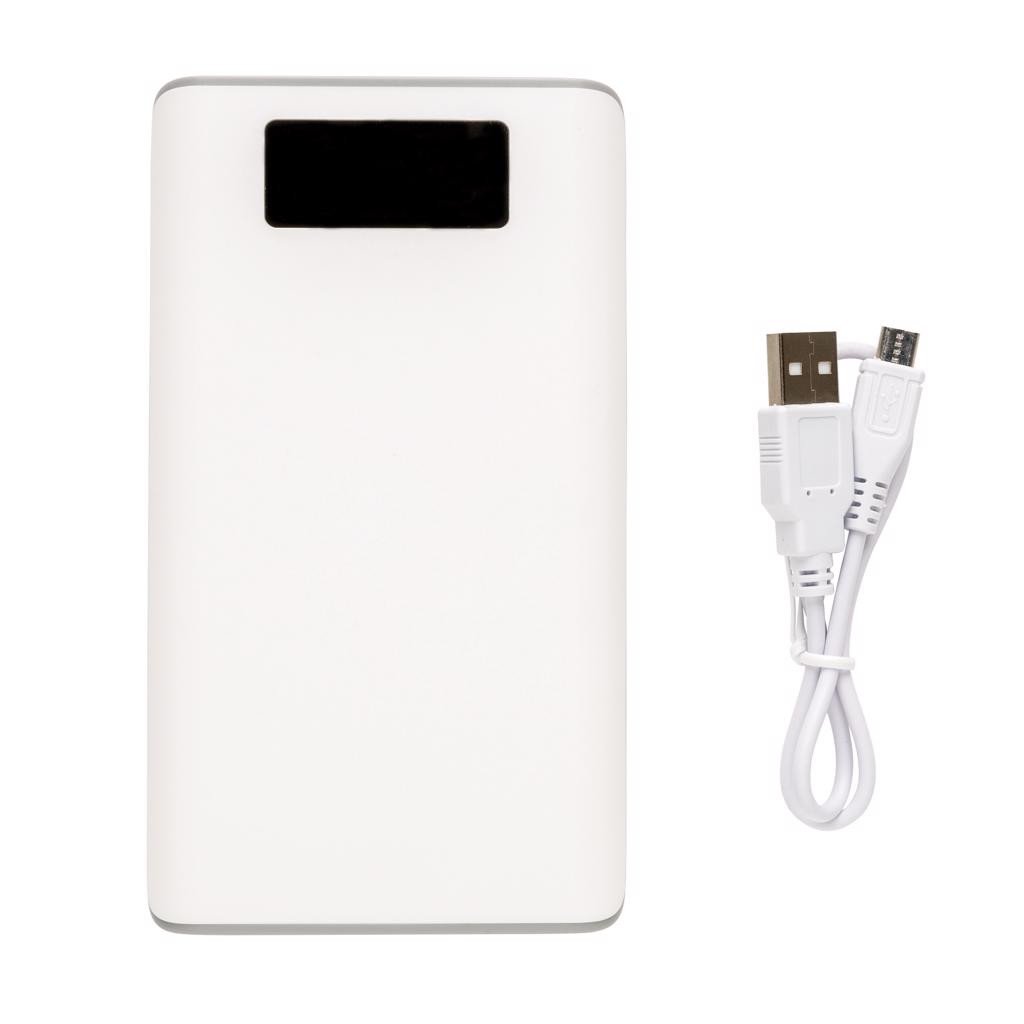 Powerbank mit 10.000 mAh Lithium Batterie und Display, welches den Ladestand anzeigt (25%-50%-75%-100%). Die Powerbank verfügt über 2 Outputs (max. 2.1A), um zwei Geräte zur selben Zeit aufzuladen. Output 5V/2.6mAh, Input 5V/2A. Inklusive Micro USB Kabel.