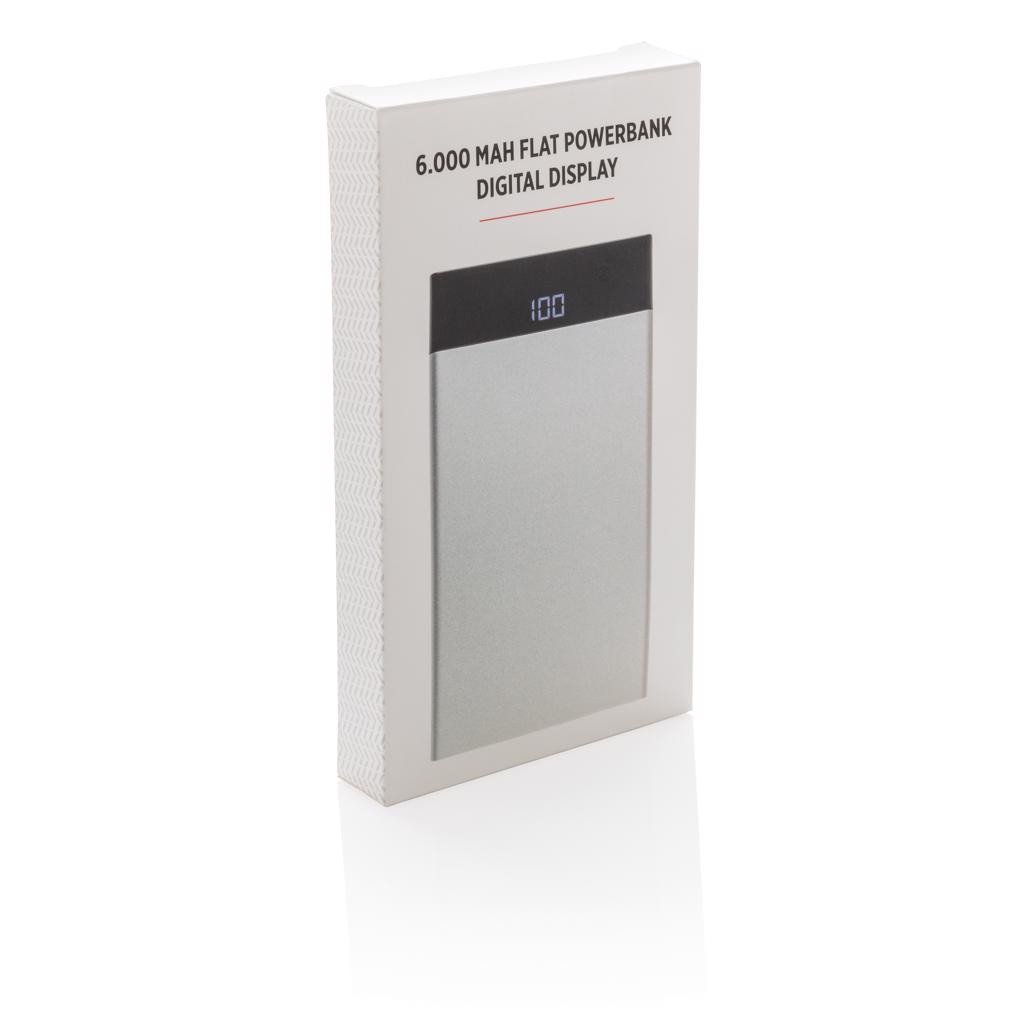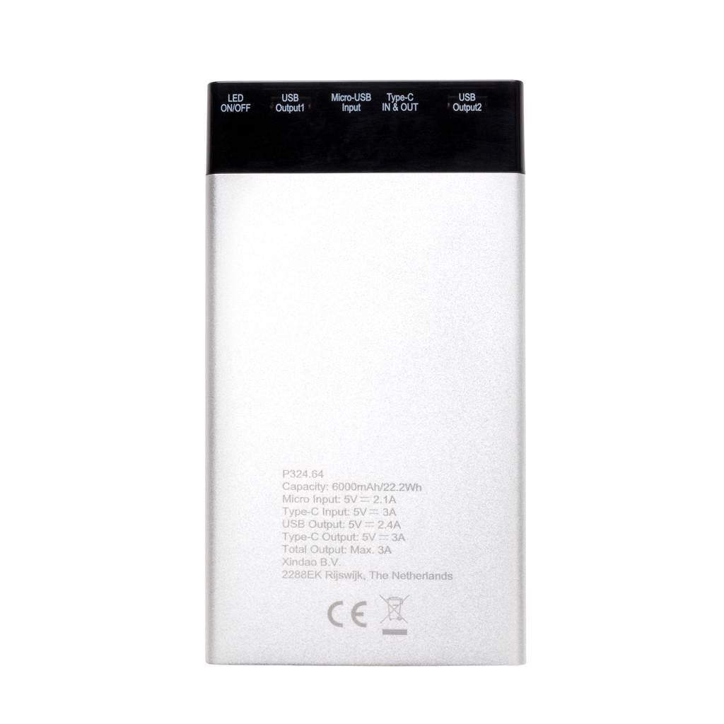 6.000mAh flache Powerbank mit langlebiger Lithium Polymer Batterie, mit regulärem USB und Type-C Kabel. Die Aluminium Powerbank verfügt über ein digitales Display zur Ladestandindikation. Die extra hohe Kapazität des In- und Outputs ermöglicht ein besonders schnelles Laden - fast doppelt so schnell wie gewöhnliche Powerbanks! Input: 5V/2.1A. Micro USB-Port-In (zum Aufladen), Type-C Input: 5V/3A. USB Output: 5V/2.4A. Type-C Output: 5V/3A.