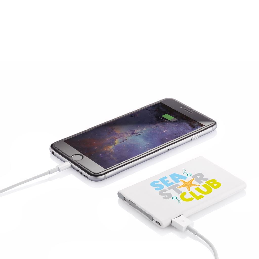 Ultradünne 2.500mAh Powerbank aus Kunststoff mit integriertem Mikro USB Kabel. An der Seite befindet sich ein USB Anschluss zum Aufladen von mobilen Geräten (z.B. iPhone 5/6) mittels Ihres eigenen Aufladekabels. Output 5V/1A, Input 5V/1A.