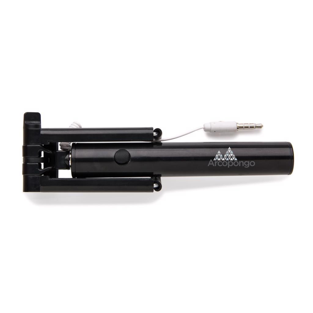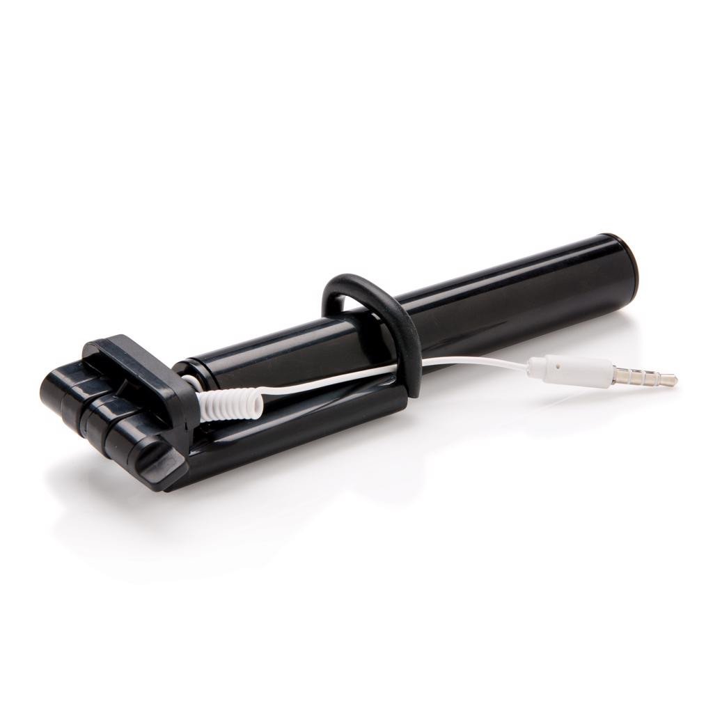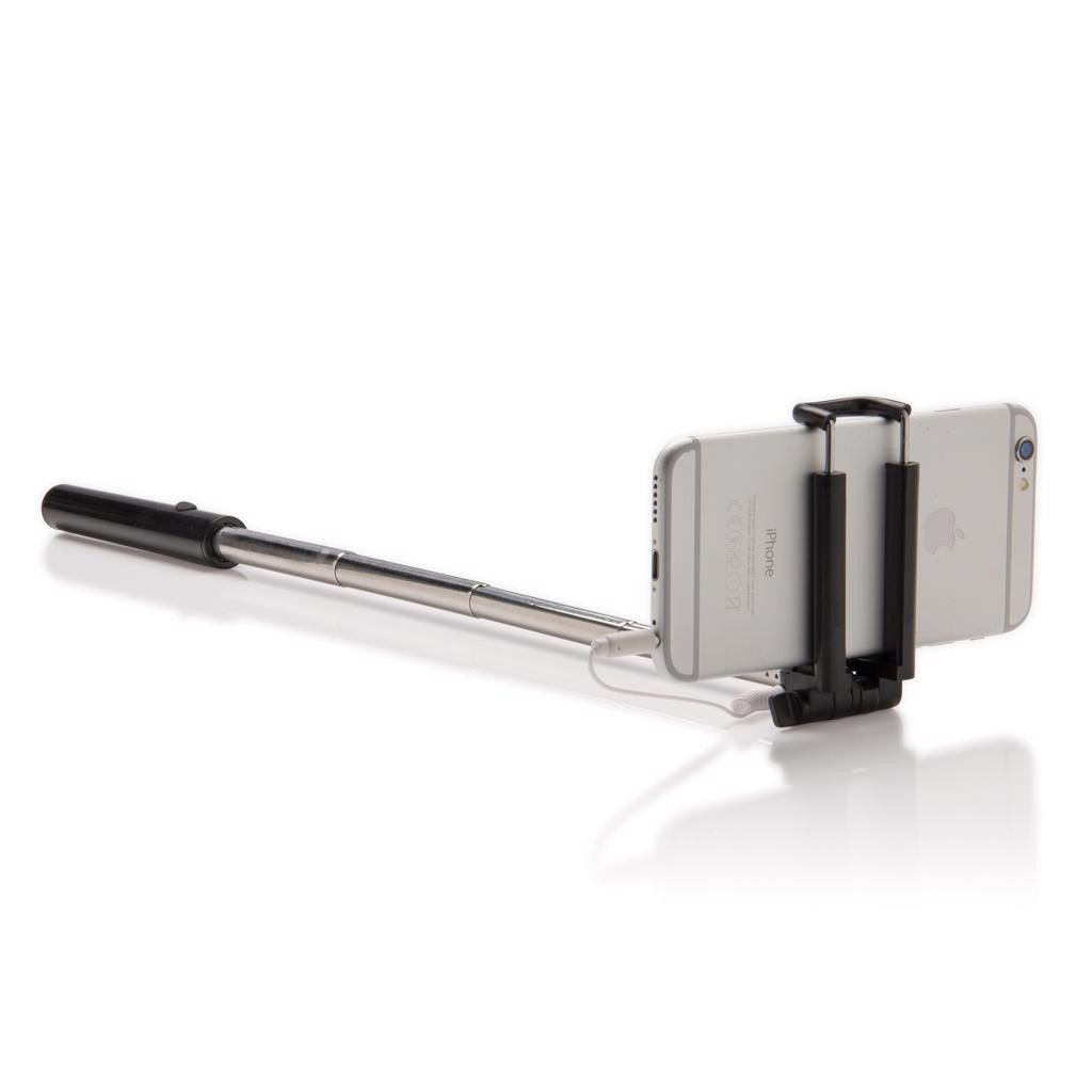 Selfie-Stick in Taschengröße aus ABS und Stange aus Edelstahl. Der Stick kann einfach über den Audiostecker angeschlossen werden, eine wireless Verbindung ist nicht nötig. Der Stick hat eine Länge von 52 cm und eingeklappt sogar nur 15 cm! Das Telefon bleibt in der richtigen Position dank der tiefen Halterung. Mit diesem Stick gelingt Ihnen sicherlich das perfekte Selfie - alleine oder mit Freunden. Für sowohl Android als auch iPhone.