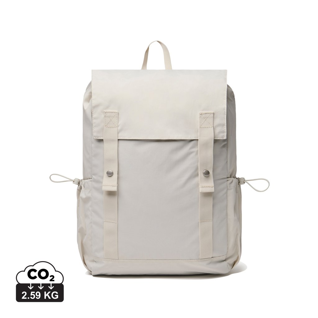 The KENTO URBAN everyday backpack is designed to carry everything you need throughout the day. It offers plenty of room for daily essentials and is ideal for day trips and travel, folding compactly when needed. Crafted from RCS-certified recycled nylon with a PU backing and finished with an RCS-certified recycled polyester 300T lining, it contains 43% certified recycled material, offering a responsible and durable solution. The design features a front flap secured with two webbing straps and magnetic button closures. Under the flap, a front zipper pocket and a spacious main compartment with dual-side drawstring closure provide easy access and secure storage. Inside, there is room for a 15.6” laptop sleeve to keep your device protected and organized. A top webbing handle and adjustable back shoulder straps ensure comfortable carrying, while side bottle holders with drawstring closure add extra practicality.