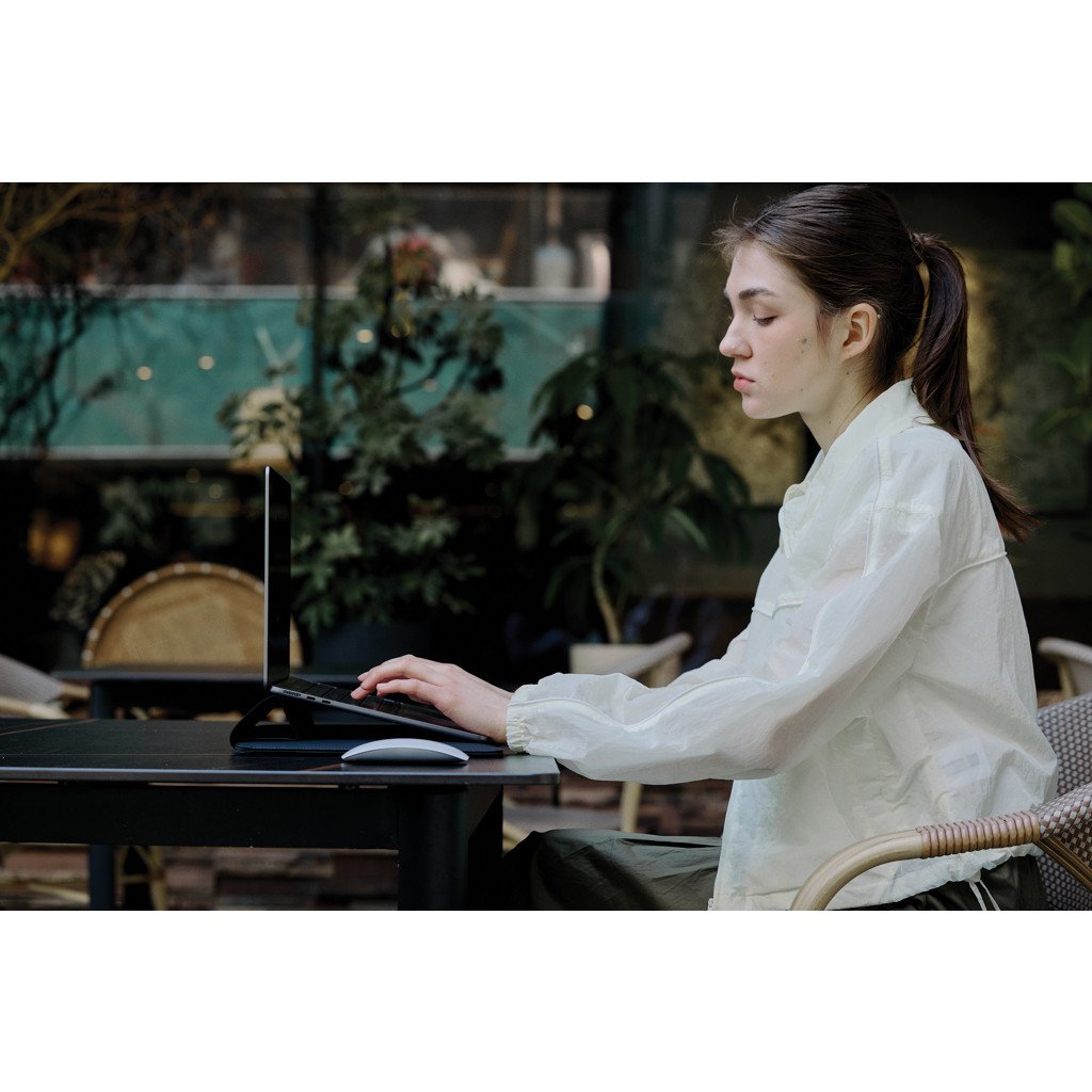 The Mobile Office Laptop Sleeve offers both protection and comfort with its innovative design, transforming into a laptop stand that provides a 4 cm incline for improved ergonomics and better laptop heat dissipation. Its rear pocket for slim essentials like phones or notebooks provide efficient storage. A sleek, functional solution for the modern professional on the go. Crafted with AWARE™, the use of genuine recycled fabric is guaranteed. 20% recycled content. Registered design®.