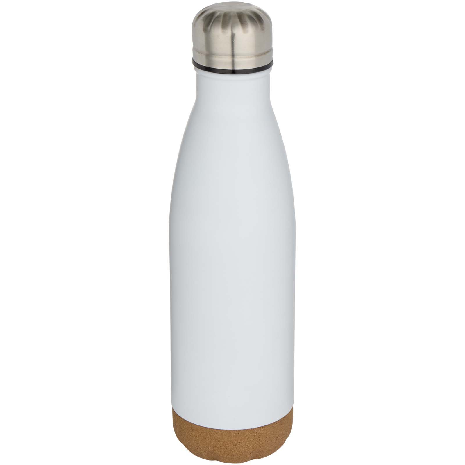 Vacuum-insulated stainless steel water bottle with cork details at the bottom. The double-wall insulation keeps drinks hot for 12 hours and cold for 48 hours. Presented in a recycled cardboard gift box. Volume capacity: 500 ml.
