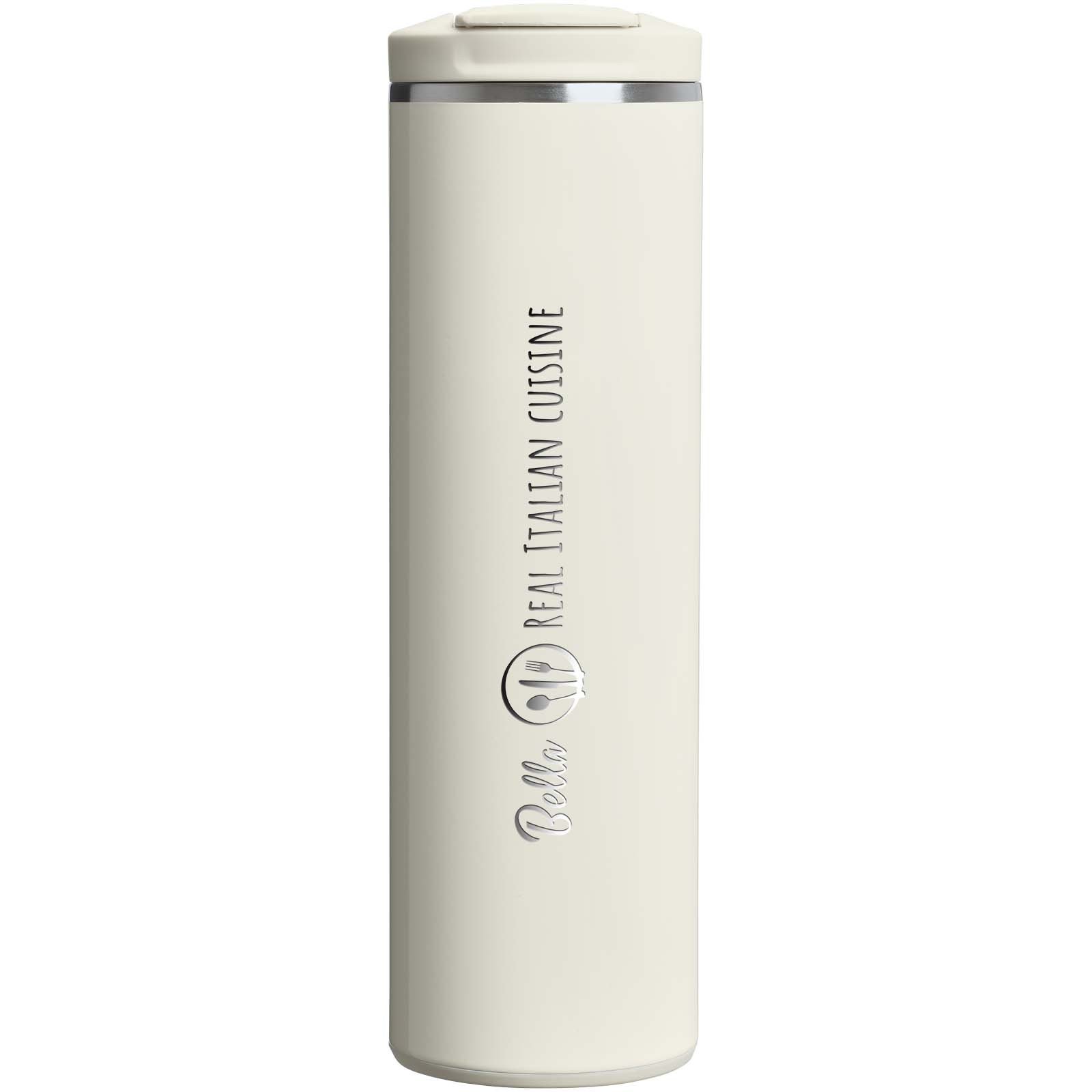 The 470 ml Transit Fliptop double-walled recycled stainless steel tumbler with vacuum insulation is made with premium technology that makes it 33% lighter than standard stainless steel. Featherweight spun-steel insulation keeps drinks hot for 4 hours or cold for 6 hours. The tumbler is leakproof and has matching silicone at the lid tab and footpad, which makes opening, closing, and setting it down quieter. Dishwasher safe and compatible with most car cupholders.