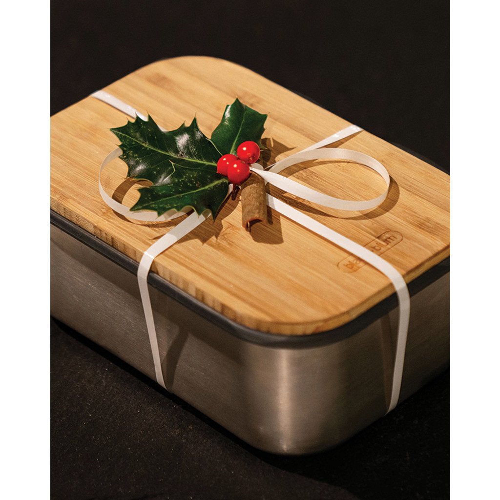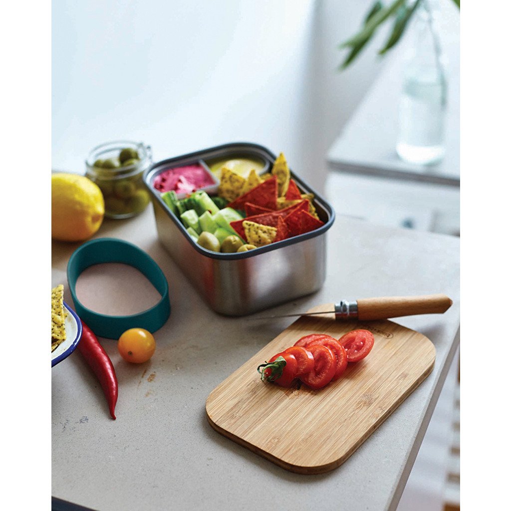 Based on the success of our first sandwich box, we have introduced this deeper version to allow you to take larger items such as fruit and yogurts with you. This is a robust, 100% plastic-free design solution for preparing and carrying your sandwiches, charcuterie, or even cheese selection! The stainless steel sandwich box is one of those products that feels familiar and trustworthy from day one, and is built to age beautifully. Use the naturally antibacterial bamboo lid as a chopping board to create your sandwiches or as a serving board to assemble the ingredients for a delectable meal later in the day. The stainless steel box protects the contents, and the silicone strap provides added security. The inner compartment helps you separate different foods, and it is microwave safe. Handwash only.