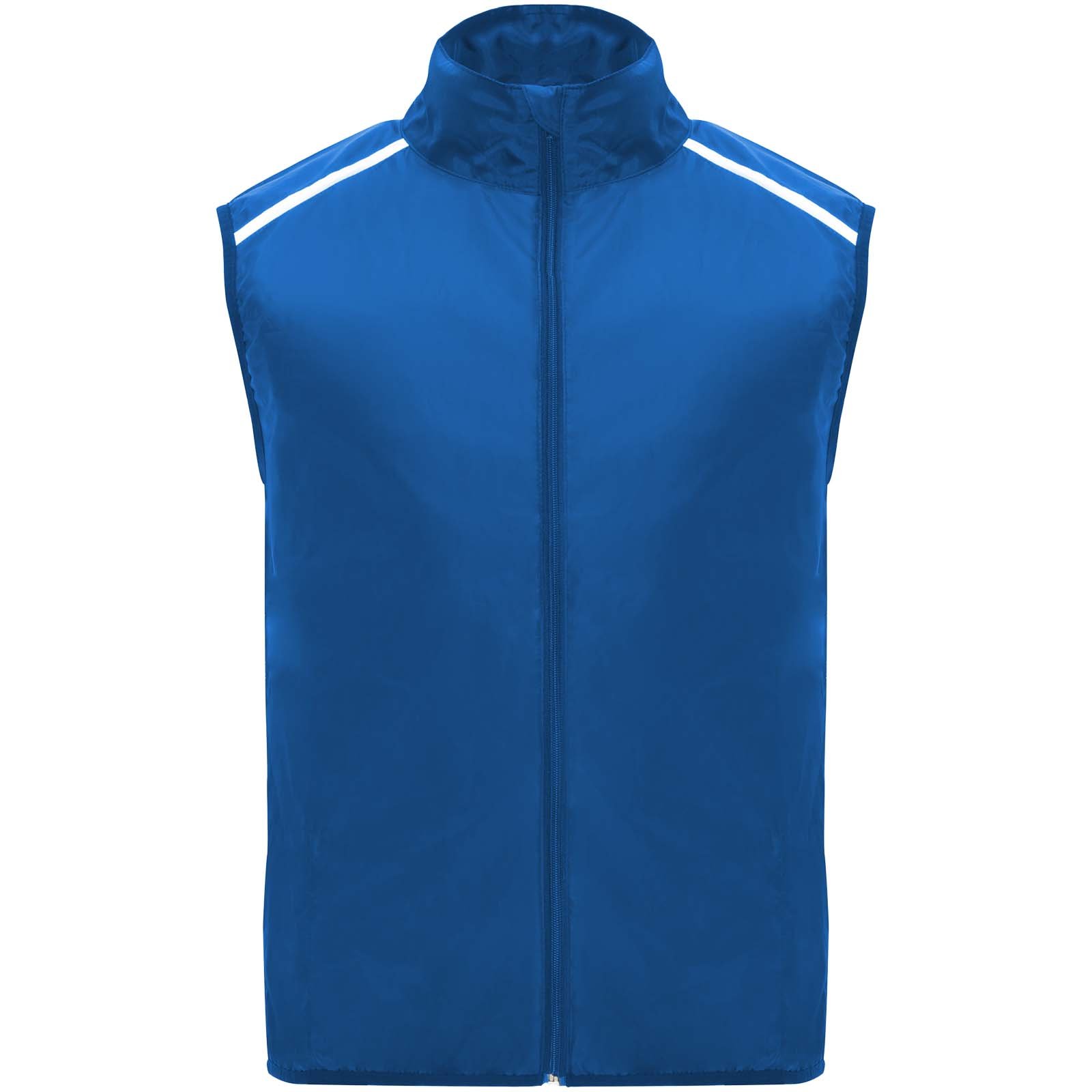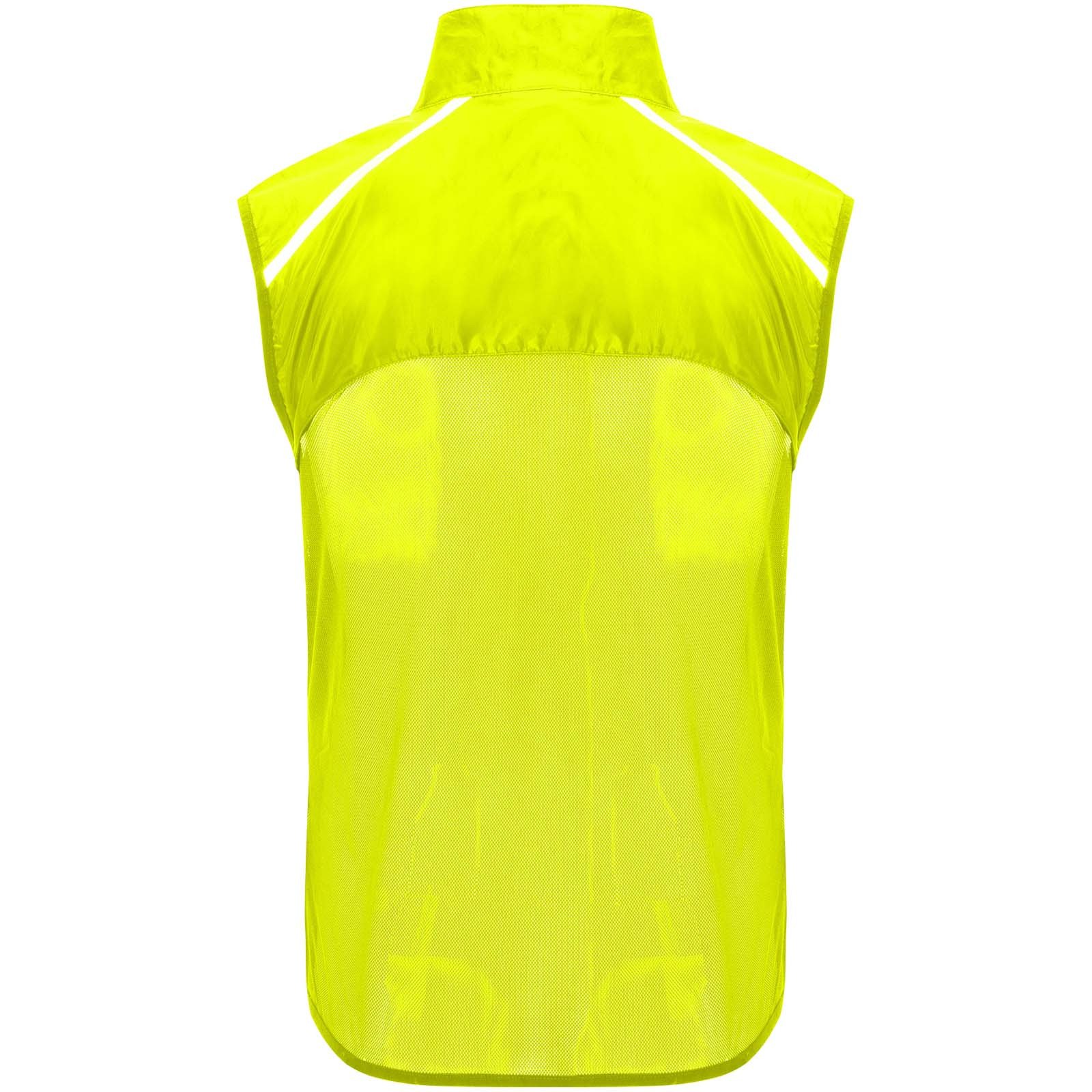Wind-proof and breathable. Front zip with matching chin protector. Elastic binding at armhole and bottom. Bottom part of the back in microperforated fabric. High-visibility details on the top, front, and back. Pocket with elastic strap to stow the vest and wear it on the wrist. Removable label.