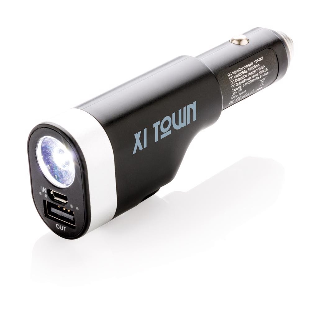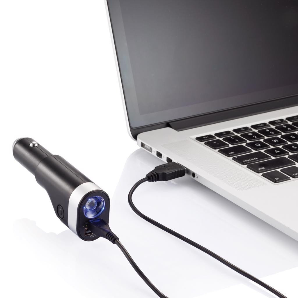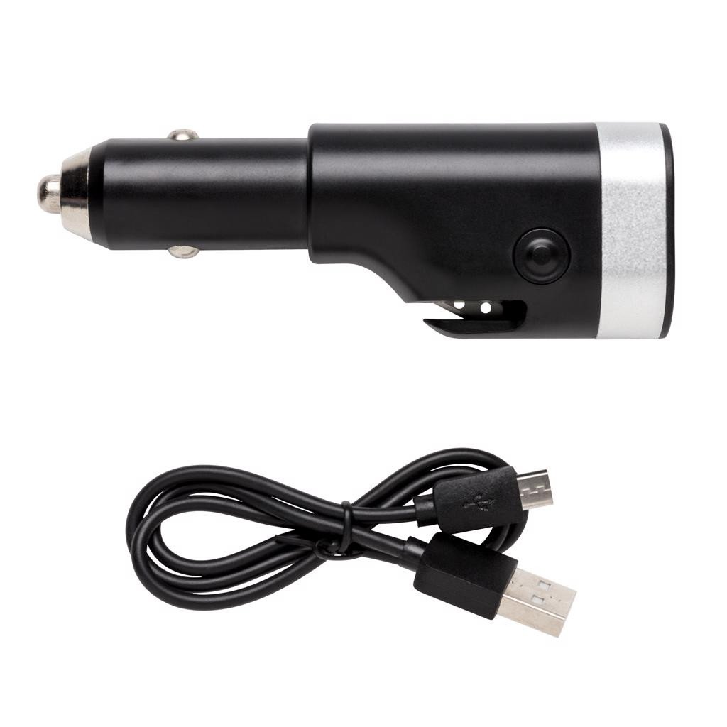 Outil de secours 6 en 1, comprenant batterie externe de 2200mAh, chargeur USB, coupe-ceinture, marteau brise-vitre de sécurité, torche LED et clignotant rouge d'urgence. La batterie externe se charge par allume-cigare ou prise murale USB. Entrée 12V-24V, sortie 5V/1A.
