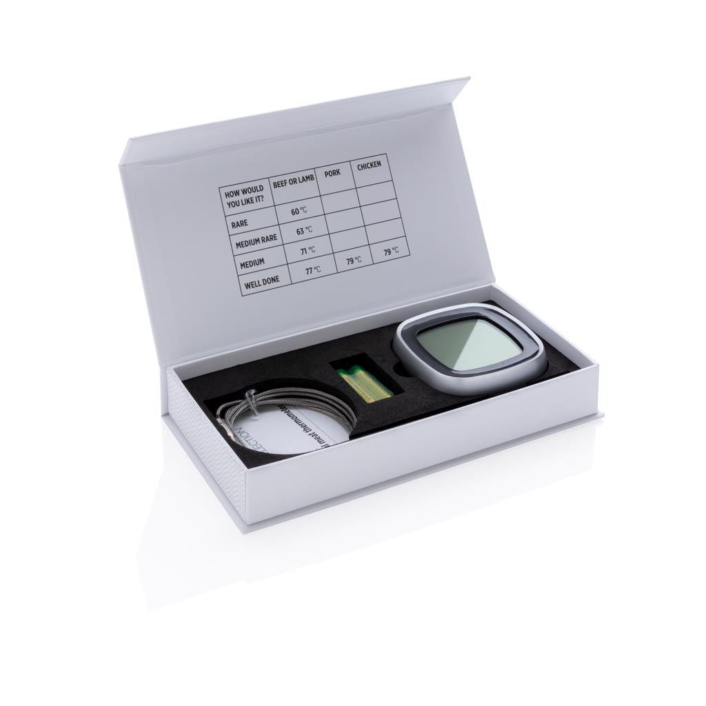 Thermomètre numérique est un outil très utile pour mesurer la température interne de la viande lors de vos barbecues ou diners. Emballé dans une boite cadeau avec quelques conseils pour cuisinier le steak parfait. Piles incluses pour une utilisation directe.
