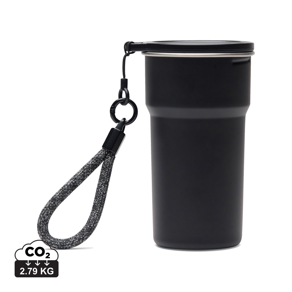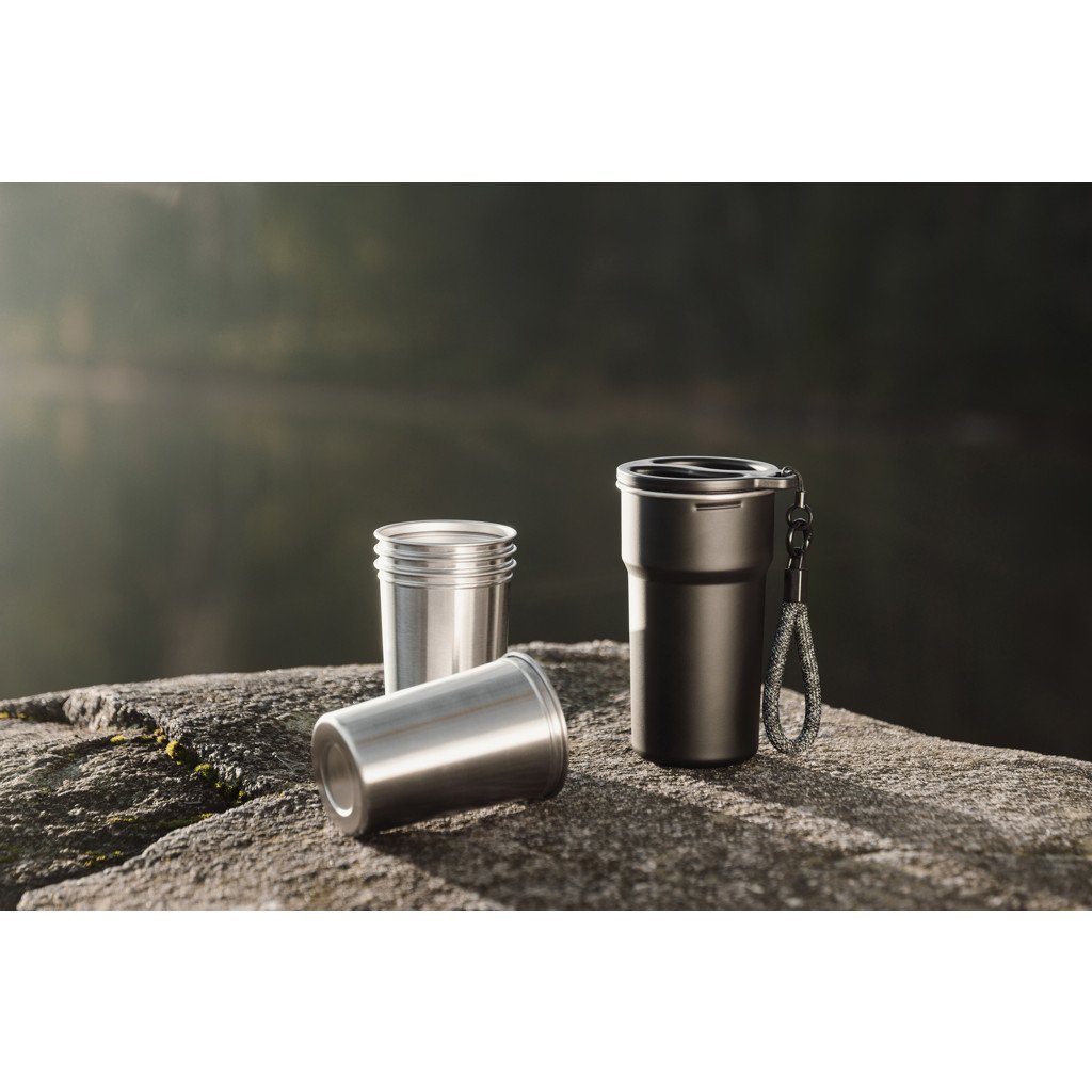Partagez l'aventure avec ce set pratique de 4 tasses en acier inoxydable recyclé. Les quatre tasses de 250 ml sont rangées dans une tasse de 450 ml dotée d'une poignée confortable, ce qui rend l'ensemble compact et facile à transporter. Une solution intelligente pour déguster des boissons ensemble, où que vous mène votre voyage. Ne passe pas au lave-vaisselle ni au micro-ondes, lavage à la main uniquement.