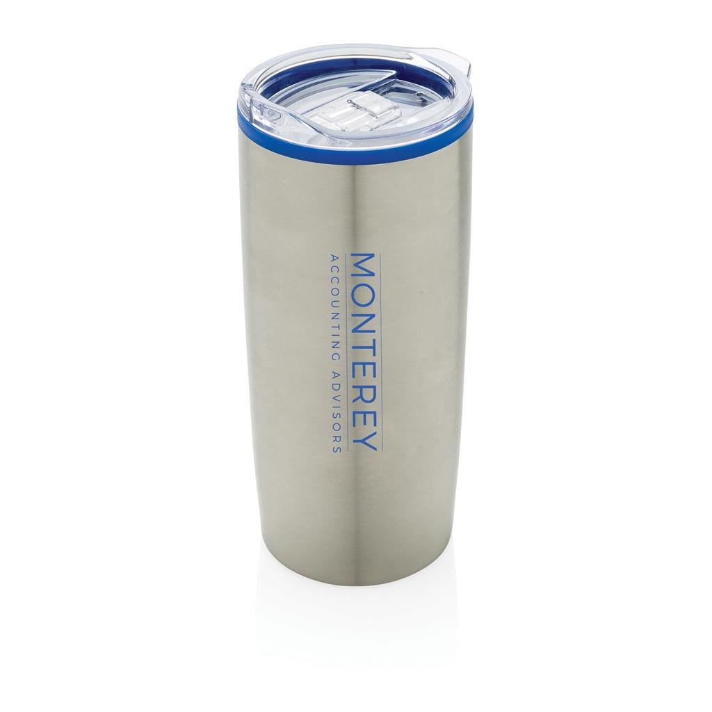 Gobelet de 590 ml à double paroi avec PP à l'intérieur et acier inoxydable 201 à l'extérieur. Couvercle coulissant, transparent, pour limiter les fuites, fond antidérapant et lavable à la main. Livré dans un emballage cadeau.