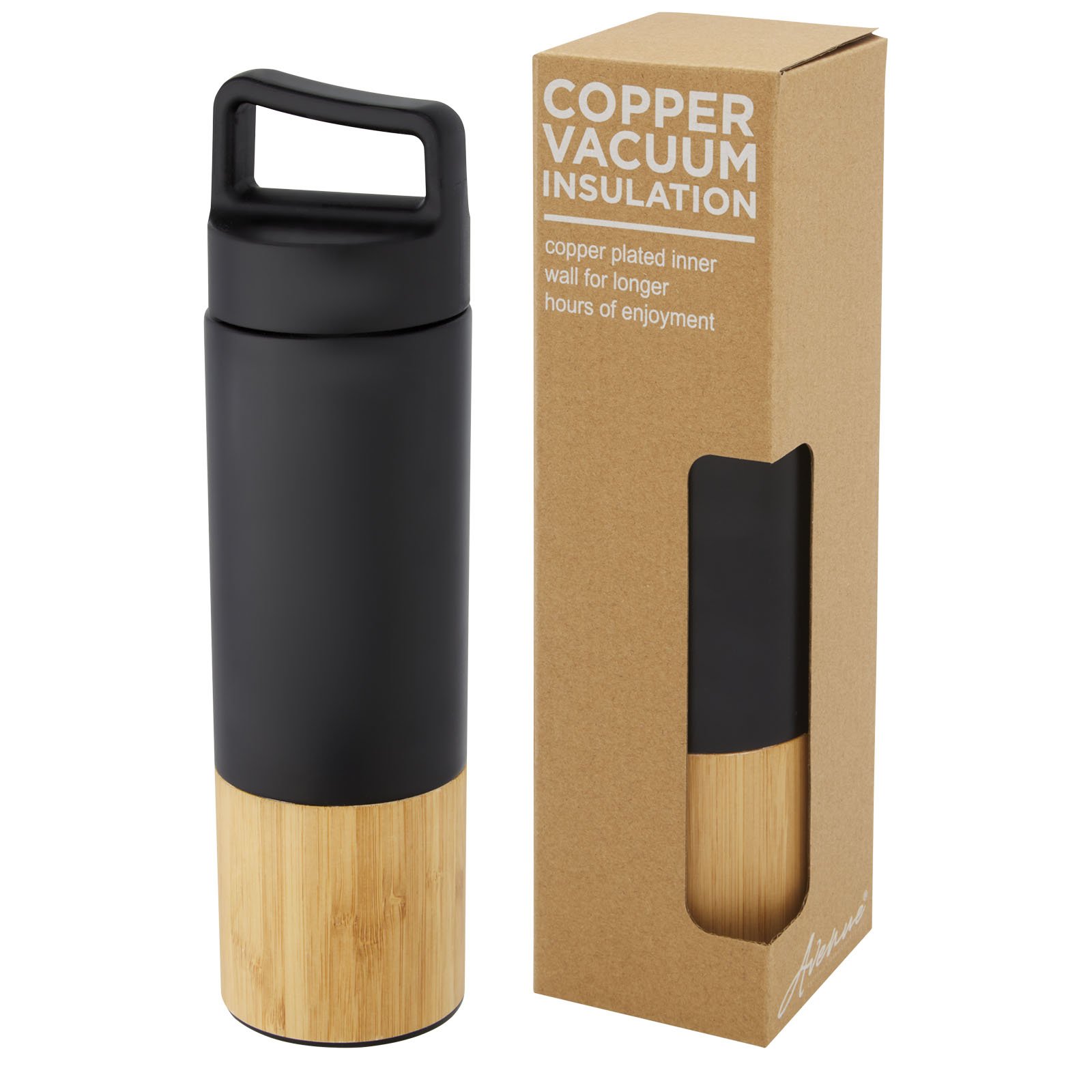 Bouteille en acier inoxydable 18/8 avec couche de cuivre et isolation par le vide, qui conserve les boissons chaudes ou froides pendant plusieurs heures. Elle présente un détail tendance en bambou et, grâce à la poignée située sur le dessus du couvercle, elle est facile à transporter. La bouteille a une large ouverture qui facilite le remplissage et le nettoyage. Testé et approuvé en vertu de la législation allemande sur la sécurité alimentaire (LFGB), et testé pour la teneur en phtalates conformément à la réglementation REACH. Capacité de 540 ml. Livrée dans un coffret-cadeau en carton recyclé.