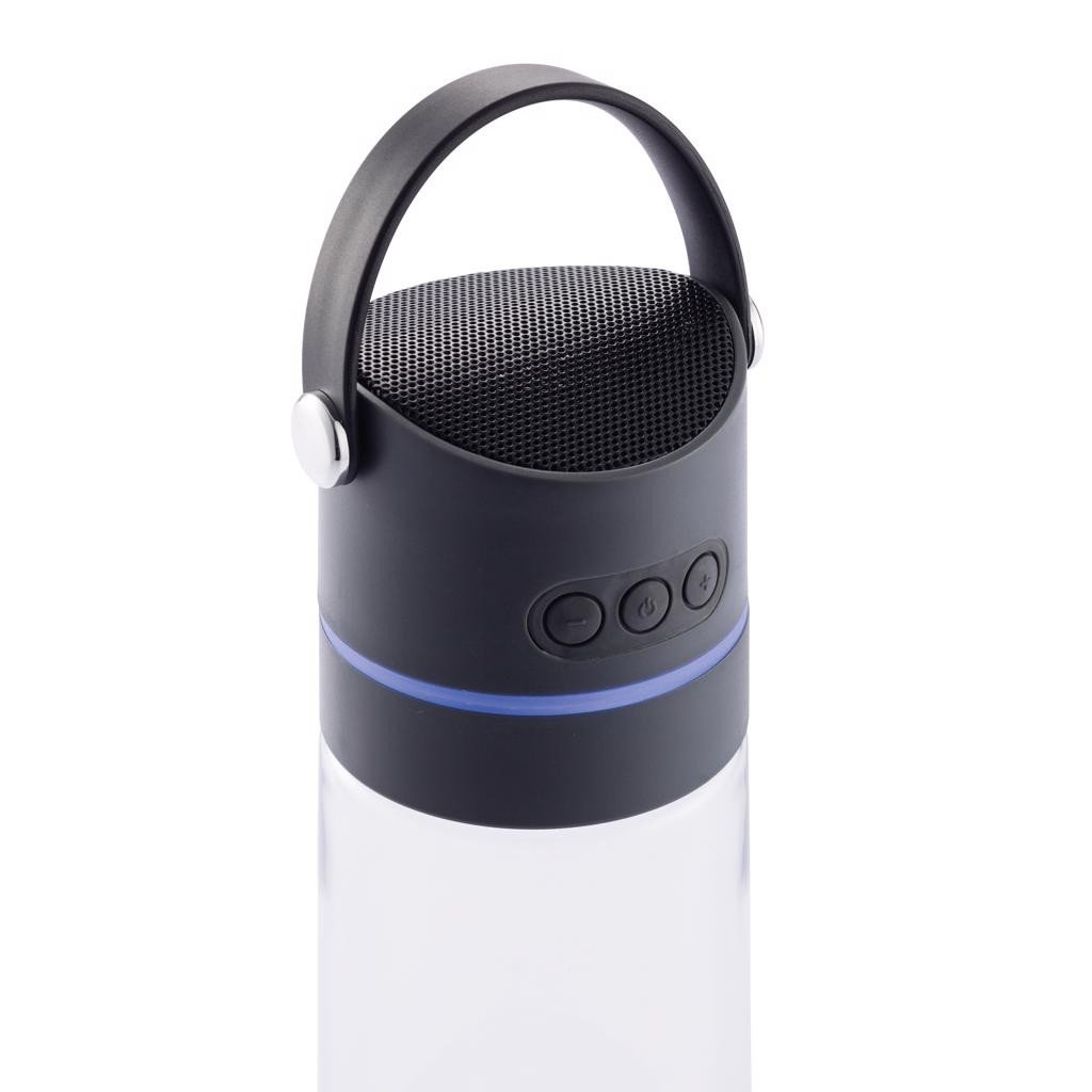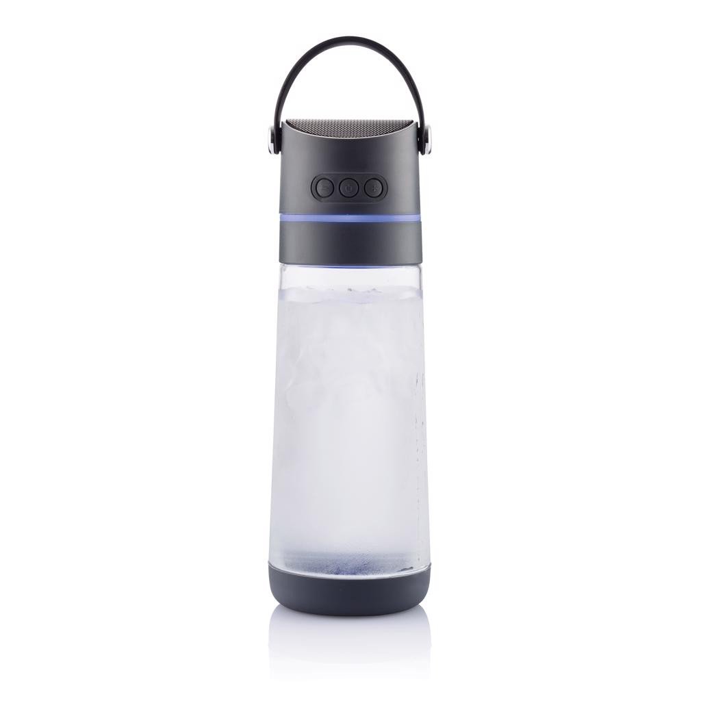 Bouteille Tritan 650ml avec un haut-parleur 3W et lumière d'ambiance intégrées. Parfait pour le sport ou les activités de plein air. Antifuite et avec dragonne. Design protégé®.