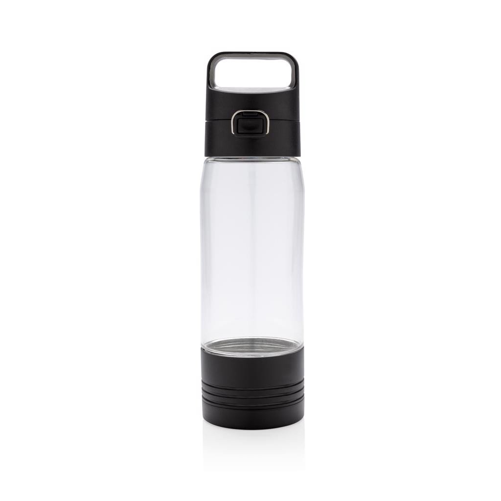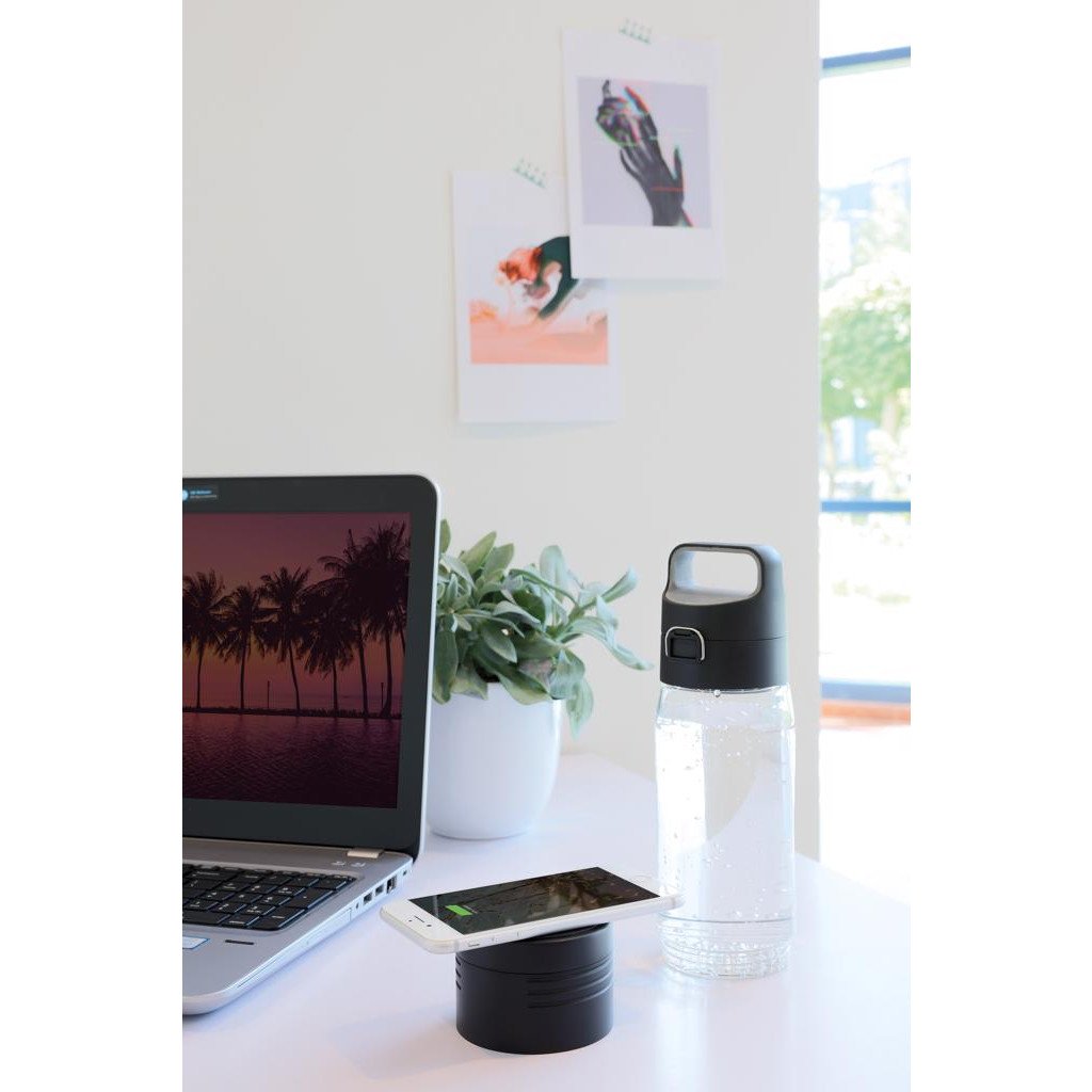 Gourde en tritan étanche avec serrure et poignée. Contenu : 600 ml. Incluant une batterie externe sans fil de 5000 mAh dans la base. Compatible avec tous les appareils compatibles QI comme Android dernière génération, iPhone 8 et plus. Entrée : 5.0 V/1.0 A. Sortie : 5.0V/2.1A. Sortie sans fil : 5W. Modèle déposé®.