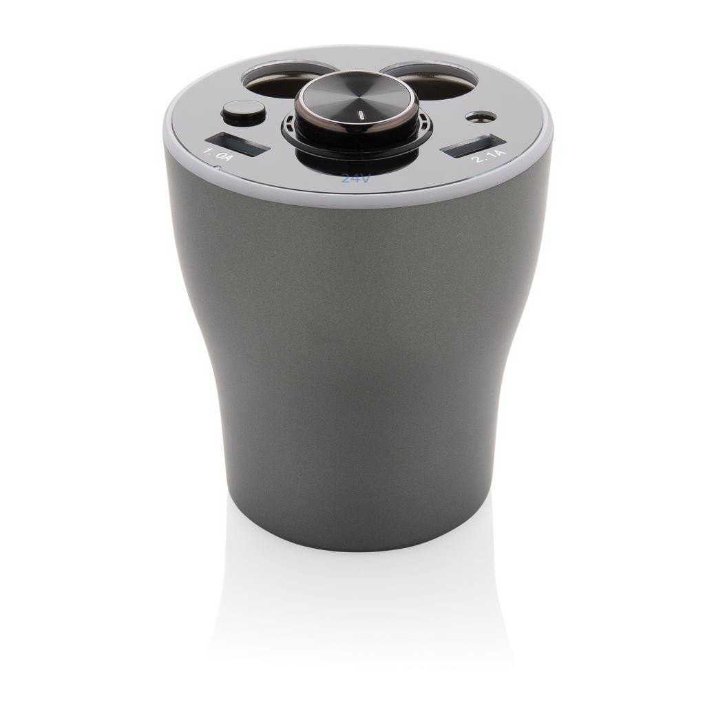 Chargeur de voiture en ABS qui se place dans le porte-gobelet de ta voiture et crée une unité de charge puissante pour tous tes appareils mobiles lorsque tu es en route. Avec deux ports USB (2.1/1A) et deux prises allume-cigare supplémentaires (65W, 8-30V, 6A). Ecouteur sans fil intégrée, pour une connexion mains libres via BT 4.1, a une batterie 40 mAh qui peut être chargée en 1,5 h pour 1h d'autonomie.