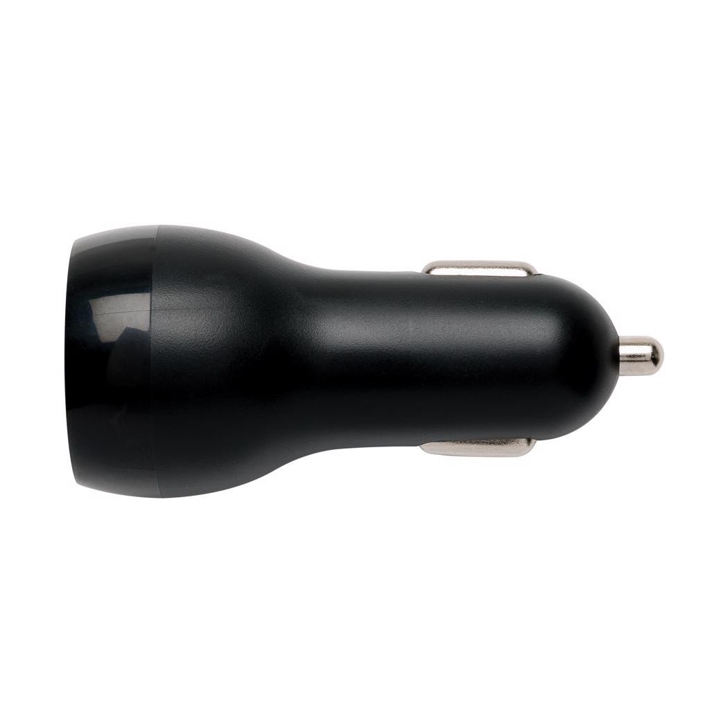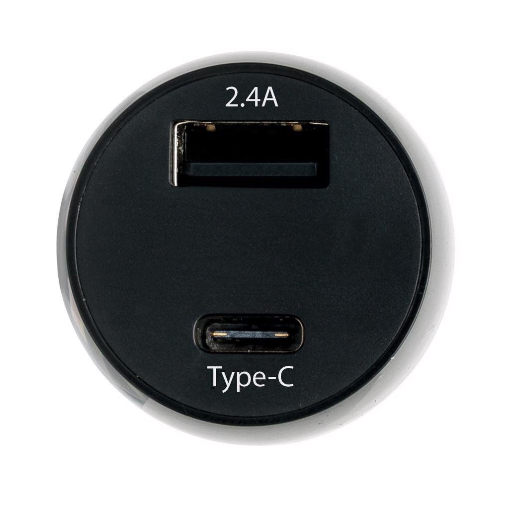 Chargeur de voiture en ABS avec un port de type C et un port USB. Idéal pour charger tout type de téléphone, même la nouvelle génération avec type C. Corps mat avec détail tendance brillant sur le dessus. Sortie 5V/2.4A (total)