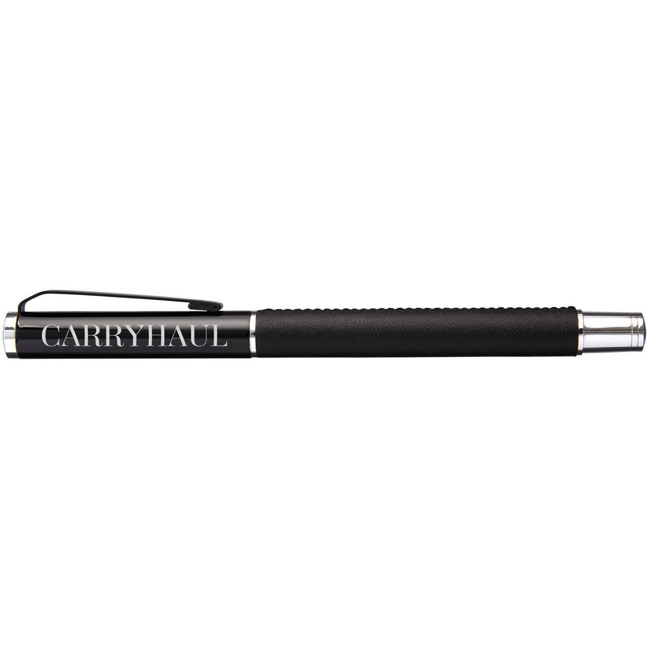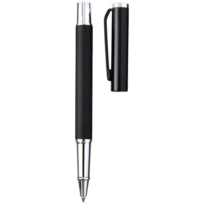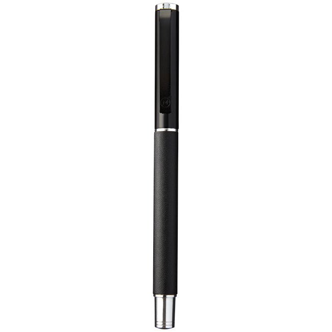 Stylo à bille roulante au design exclusif. Le corps inférieur est enveloppé de cuir PU et le corps supérieur est noir mat avec des accents chromés. Le stylo comprend une cartouche d'encre noire à bille roulante de première qualité. Emballé dans un coffret de deux pièces Marksman®.
