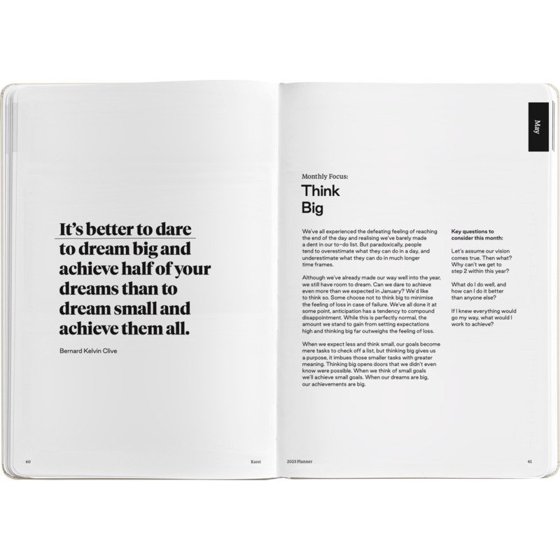 Le semainier A5 Karst® est la combinaison ultime d'un planificateur d'objectifs et d'auto-amélioration et du carnet de notes le plus vendu de la marque. Cet agenda à couverture rigide avec 162 pages lisses en papier de pierre présente une semaine par feuillet, 12 thèmes de motivation mensuels pour le développement personnel, des questions de réflexion hebdomadaires et mensuelles et la définition d'objectifs quotidiens. Son index vous permet de rester bien organisé, tout en étant inspiré par les citations motivantes.