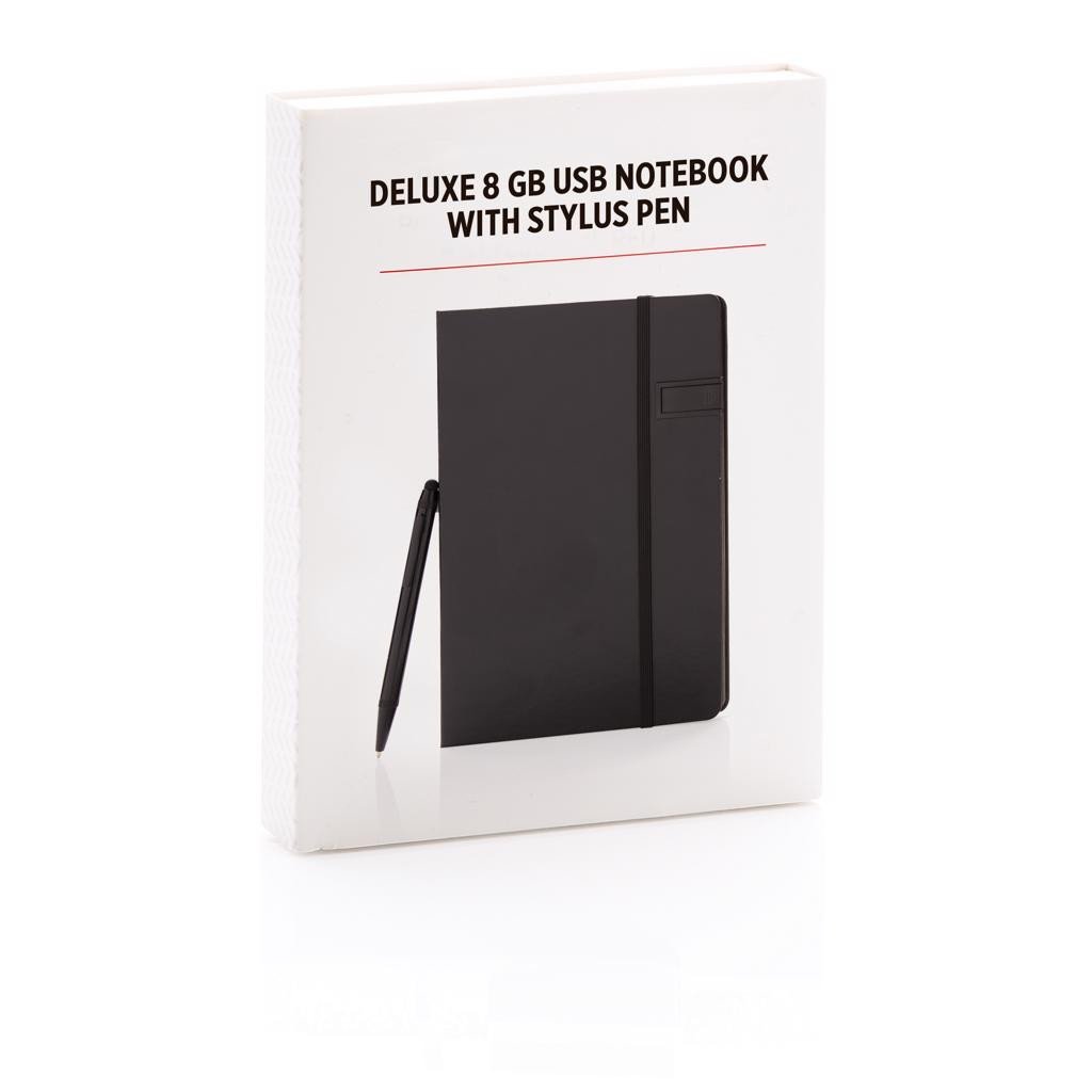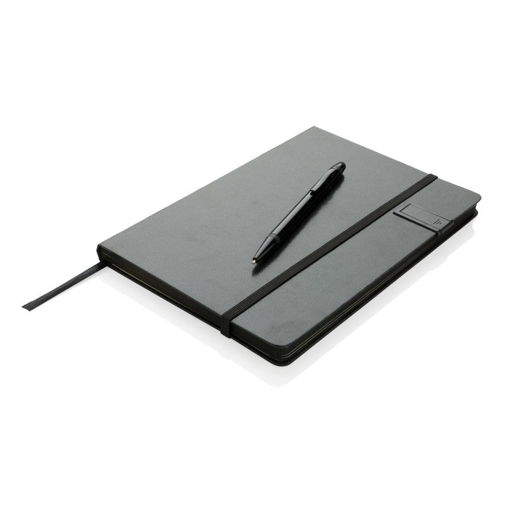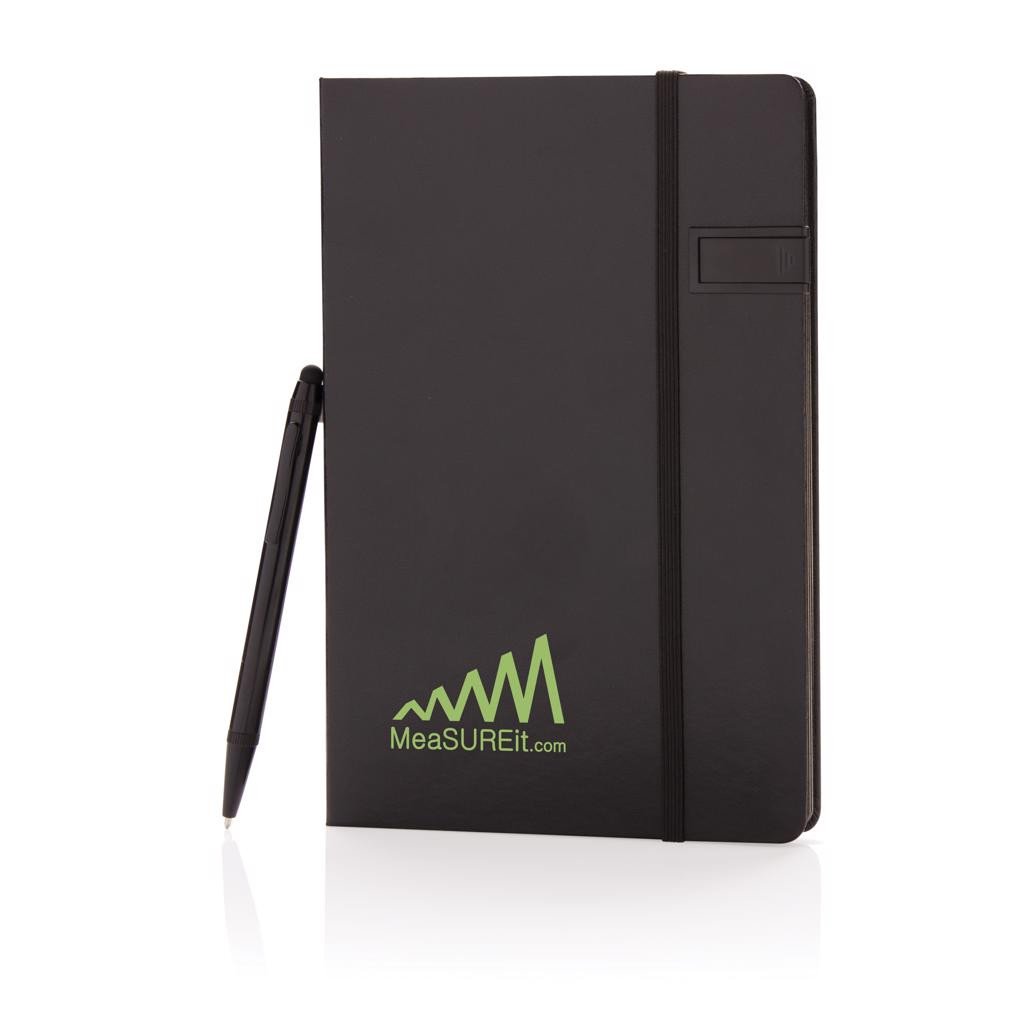 Carnet de notes A5 à couverture rigide avec clé USB 8Go. Stylet en aluminium et bord de pages assorties. 160 pages 80g/m² (papier crème). Emballé dans une boite cadeau.