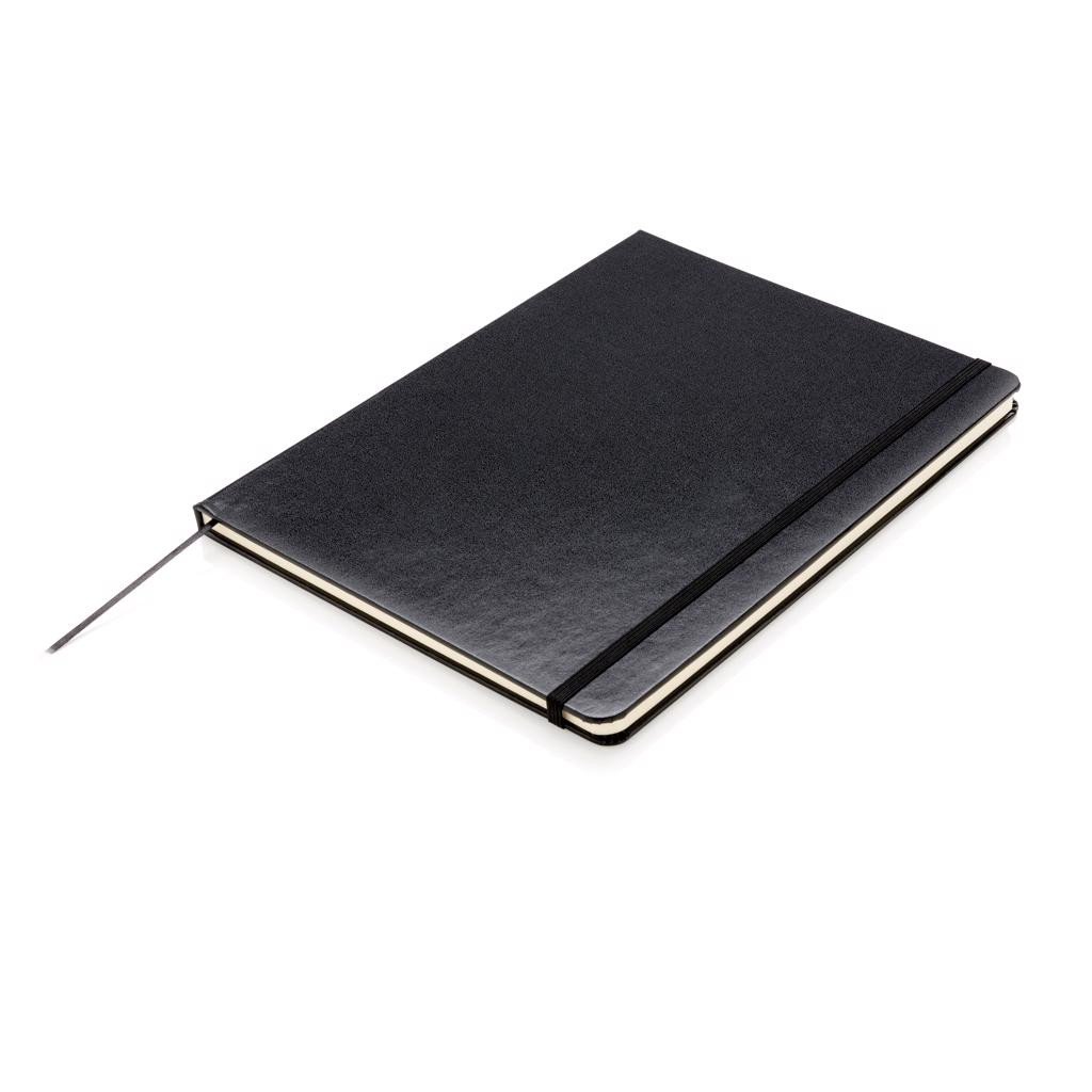 Carnet de notes B5 (19 x 25cm) à couverture rigide, 144 pages de 70g/m² (papier crème), avec bande élastique, lignes noires et marque-page.