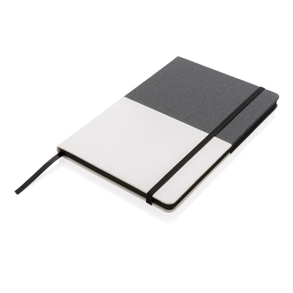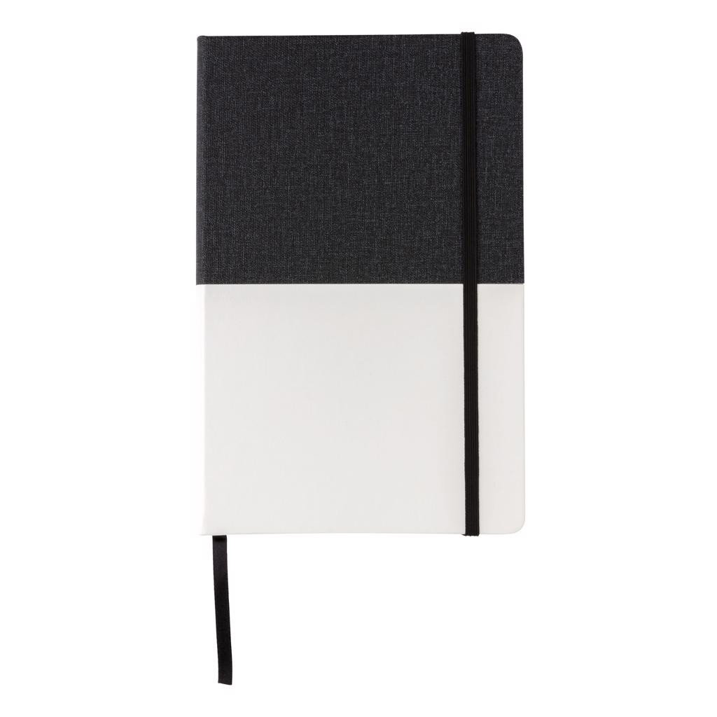 Carnet de notes A5 Deluxe bi-matière : PU et tissu (coton), avec 96 feuilles/192 pages de 80g/m² (papier crème) et lignes noires. Le bord des pages est dans une couleur assortie à la bande élastique et au marque-page.