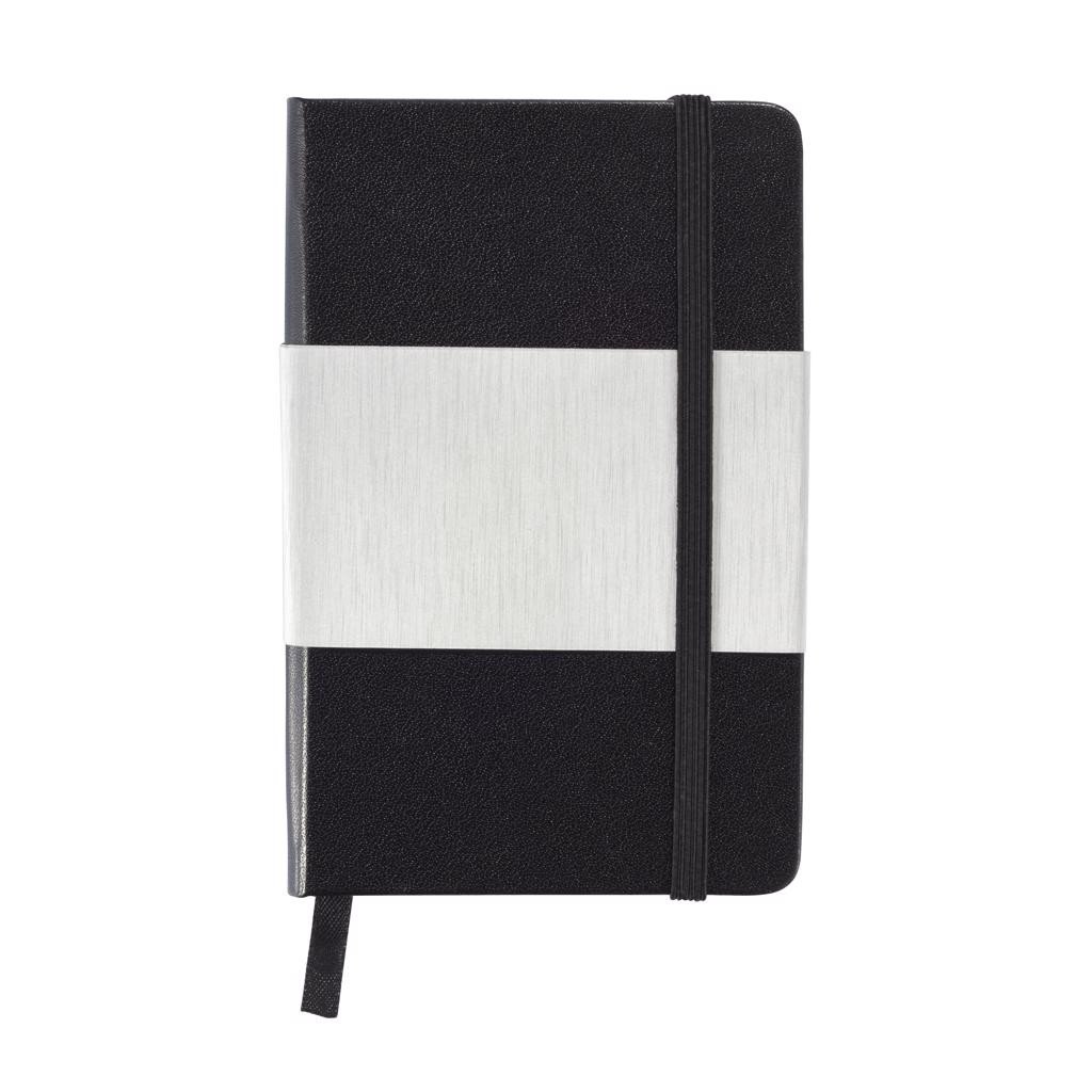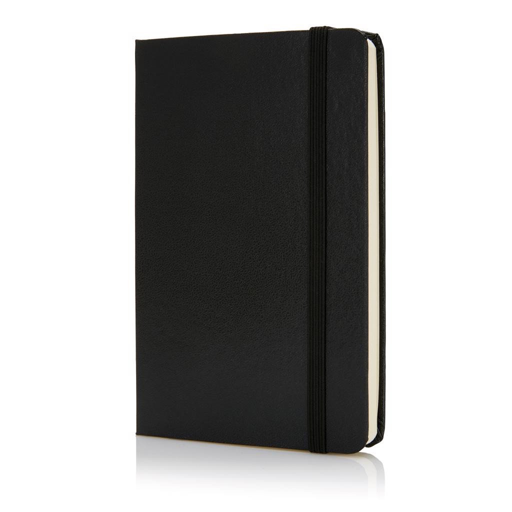 Carnet de notes A6 à couverture rigide avec bande élastique, avec 160 pages de 80g/m² (papier crème), lignes noires, pochette à soufflet et marque-page noir.