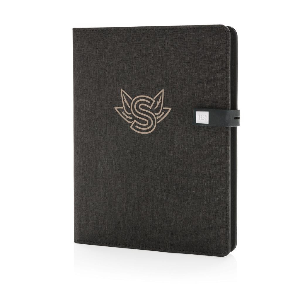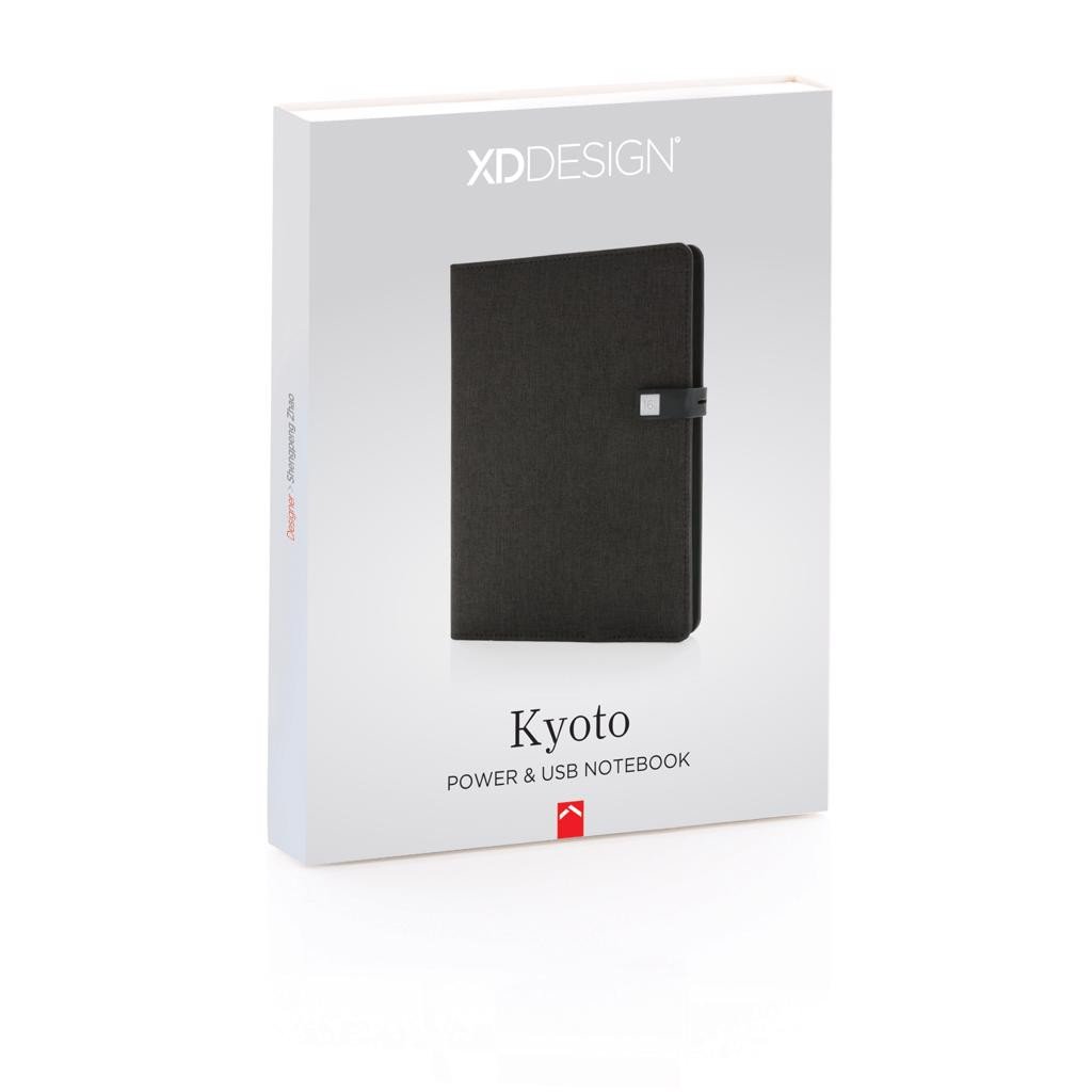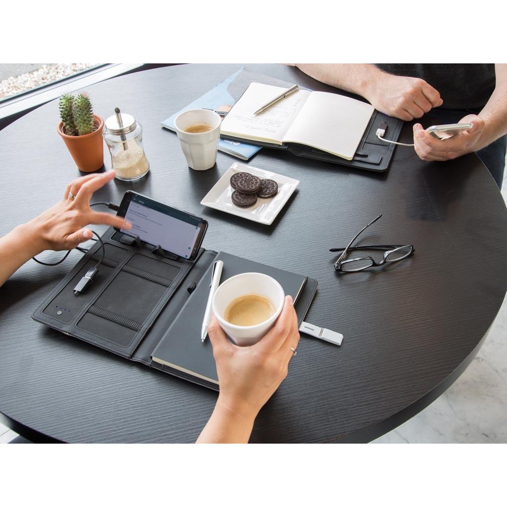 Kyoto couvre votre carnet de notes avec style. La housse en tissu dispose d'une batterie de secours 3000 mAh intégré, d'un support pour téléphone et d'une clé USB 16 Go 2.0 à l'intérieur de la fermeture magnétique. Carnet de notes A5 de 64 pages 80g/m² (papier crème) qui peut être remplacé. Sortie & entrée : 5V/1A. Modèle déposé®.