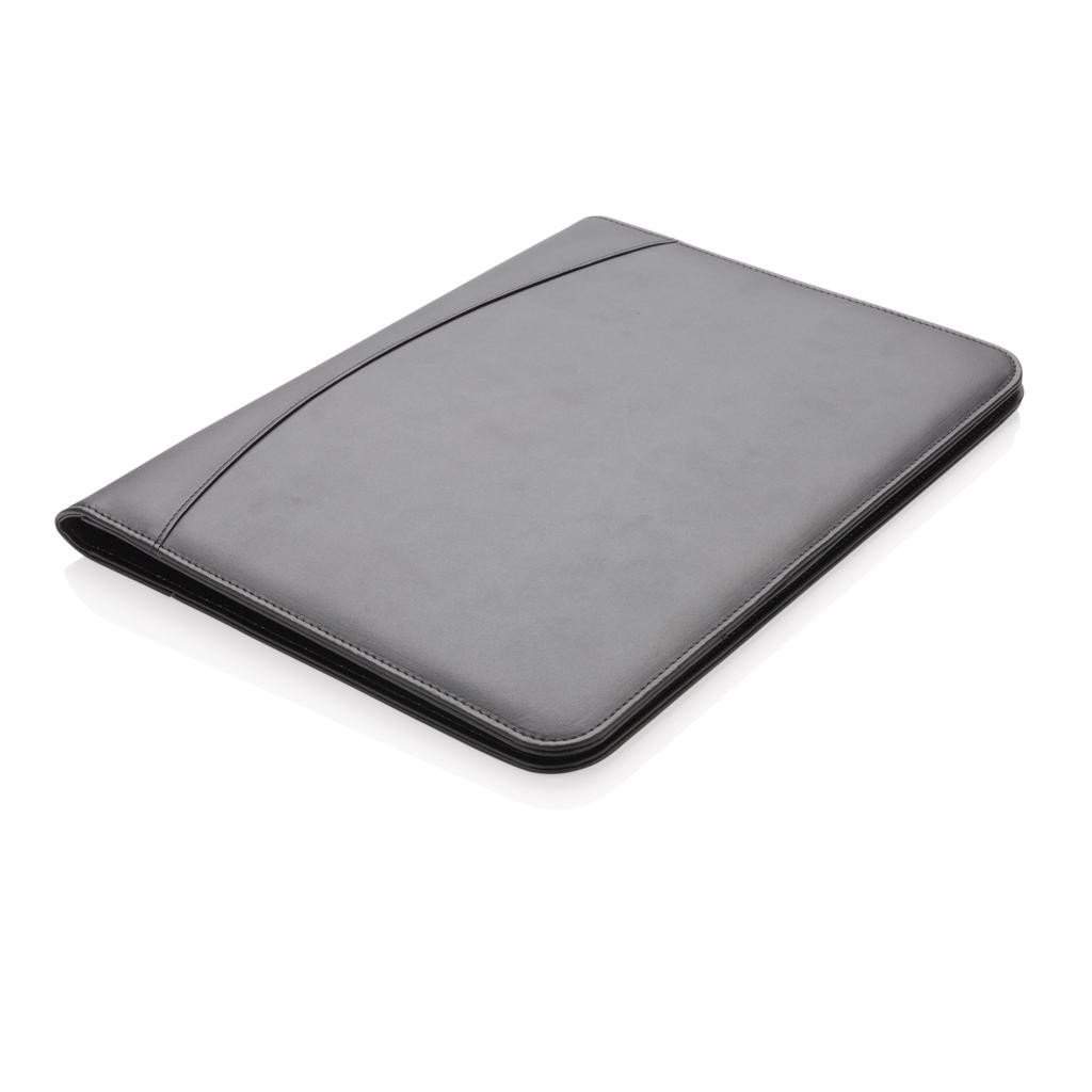 Conférencier A4 en PU. Intérieur: support de la tablette, support téléphone avec fenêtre transparente qui vous permet de visualiser et d'y accéder, adapté pour iPhone 6 et Samsung S6 etc. Brides élastiques permettant de ranger clé USB, câble de charge et batterie de secours. 5 portes cartes. Avec un bloc-notes A4 de 20 feuilles. Compatible avec toutes les tablettes iPad, Android et Microsoft Windows.