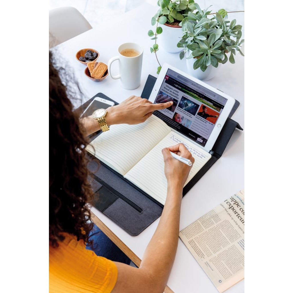 Ouvrez la nécessaire de correspondance Kyoto, et vous verrez qu'un bureau entier peut tenir à l'intérieur, y compris votre tablette 10 pouces (que vous pouvez également tenir debout). Comprend une batterie externe sans fil de 4000 mAh. Compatible avec tous les appareils compatibles QI comme Android dernière génération, iPhone 8 et plus. Entrée : 5.0 V/1.0 A. Sortie : 5.0V/2.1A. Sortie sans fil : 5W. Fabriqué en rPET (bouteilles PET recyclées). Comprend un carnet de notes amovible de 128 pages lignées de couleur crème de 80 g/m². Modèle déposé®.