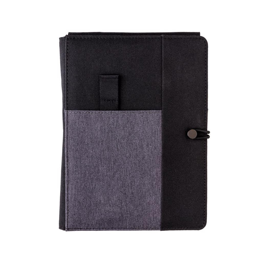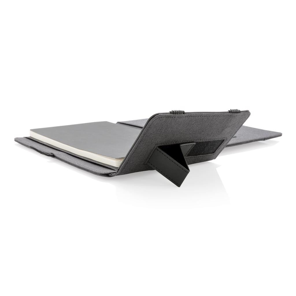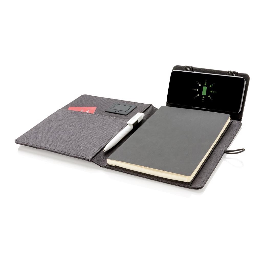 XD Xclusive Kyoto A5, nécessaire de correspondance avec chargeur sans fil. Ecrivez et rechargez votre téléphone sans fil en même temps ou lorsque vous êtes en déplacement. Avec carnet de notes amovible, 128 pages lignées de couleur crème de 80 g/m². Inclut une batterie externe sans fil de 4 000 mAh. Compatible avec tous les appareils compatibles QI comme Android dernière génération, iPhone 8 et plus. Entrée : 5.0 V/1.0 A. Sortie : 5.0V/2.1A. Sortie sans fil : 5W. Fabriqué en rPET (bouteilles PET recyclées). Modèle déposé®.